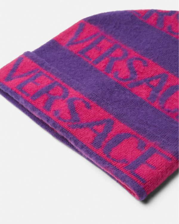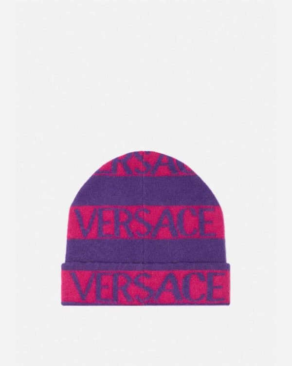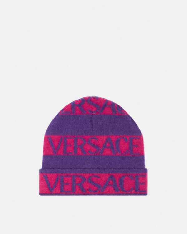 A warm beanie featuring a jacquard striped Versace Allover Kids print.