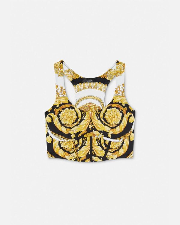 Designed for low-impact yoga workouts, this sports bra features a racerback and an all-over Crete de Fleur print in breathable, stretch material. Corset-inspired seams add a Very Versace touch to the activewear style.
