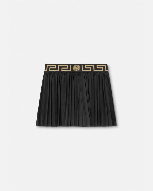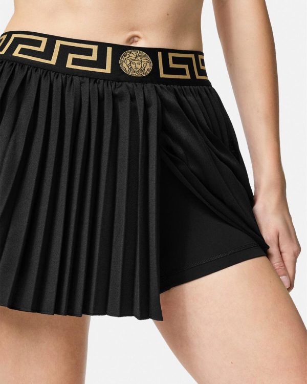 A hybrid activwear design comprised of stretch bycicle shorts underneath a pleated skirt. An elasticated Greca border waistband completes the layered style.