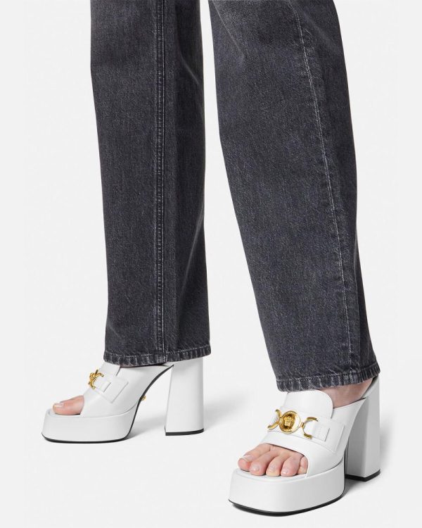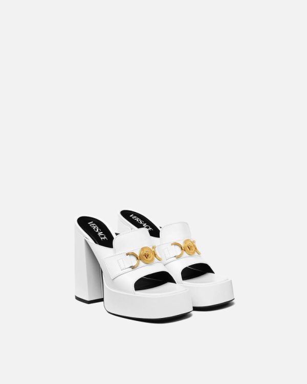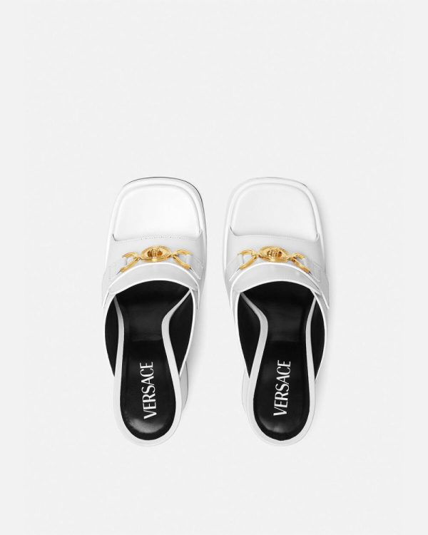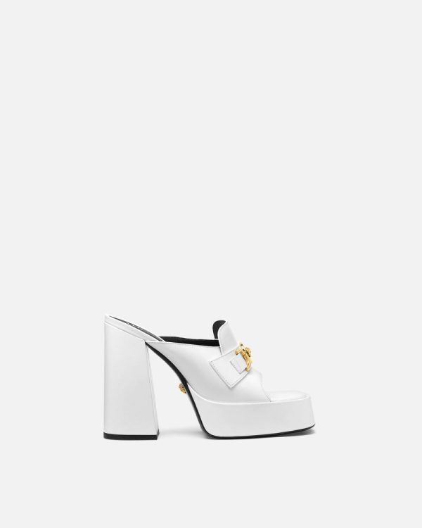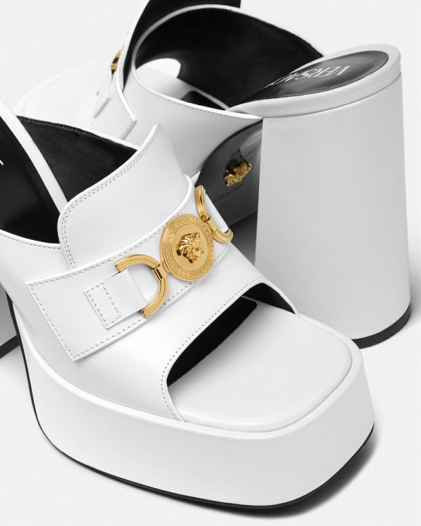 These mules are crafted in leather and enriched with a Medusa ’95 hardware on the front strap. The design has a squared toe and a platform block heel.