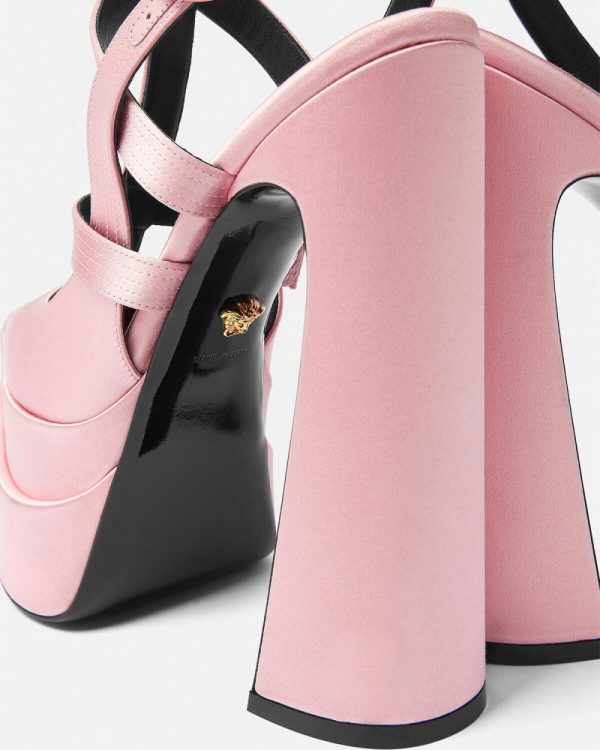 These satin slingback pumps feature a cage-like strap construction with ‘nastro Gianni’ archival stitching. They are set on a slanted high-block heel and double platform. Dua Lipa x Versace is a capsule of styles designed in collaboration with Dua Lipa and presented on the runway in Cannes.