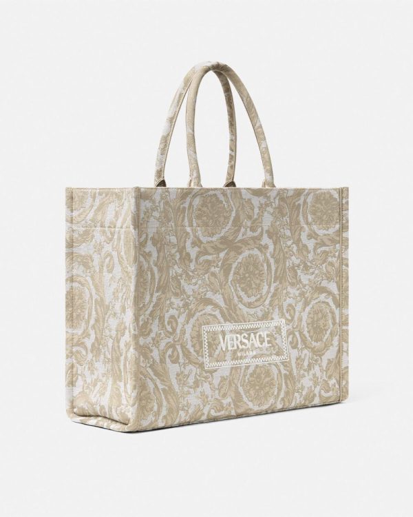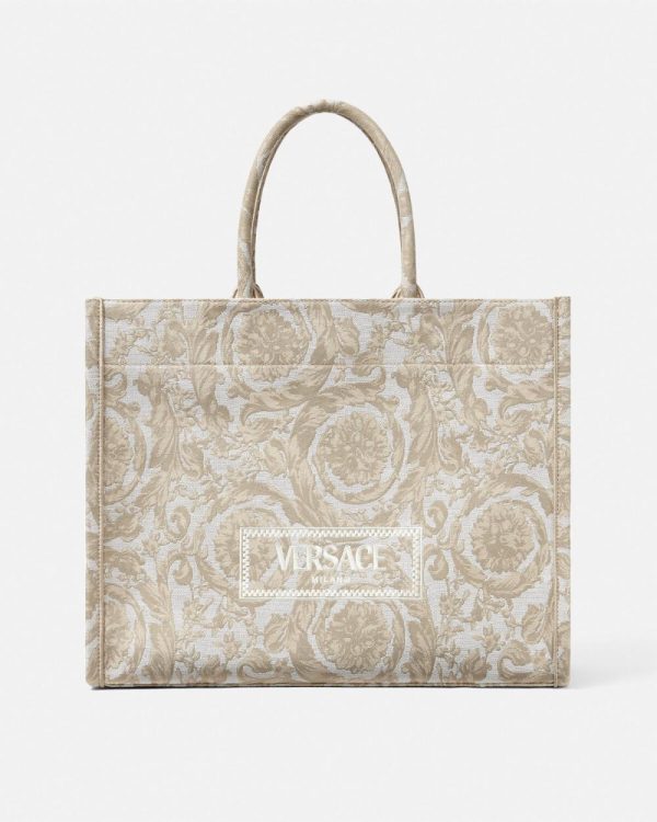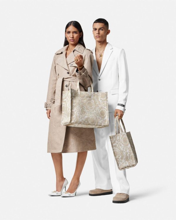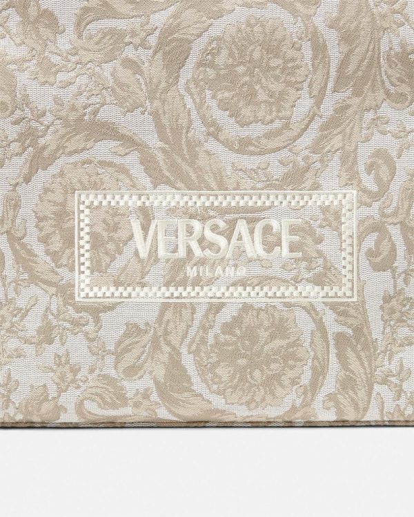 This large canvas tote bag features a tonal jacquard Barocco pattern throughout, tubular top handles, and Versace’s signature ’90s Vintage Logo embroidery.