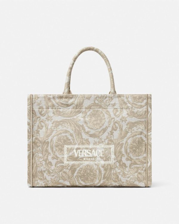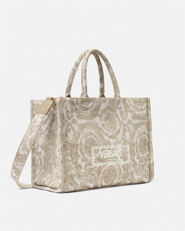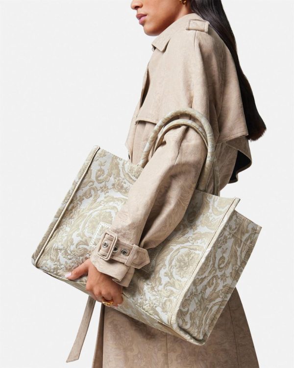 This tote bag is crafted from jacquard Barocco canvas and features rigid top handles and a detachable crossbody strap that allows for multiple carry options. The spacious design is finished with a ’90s Vintage Logo Versace embroidery.