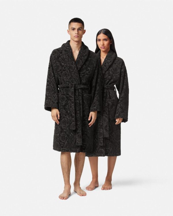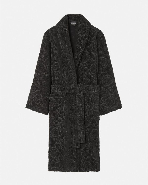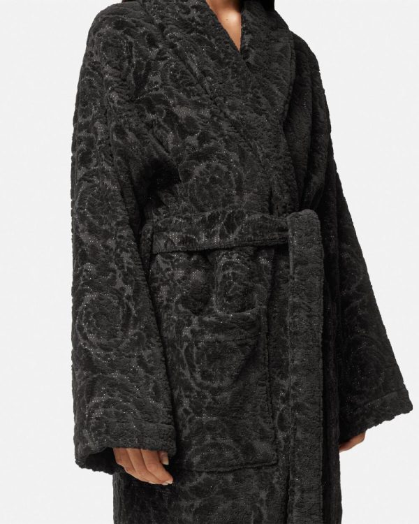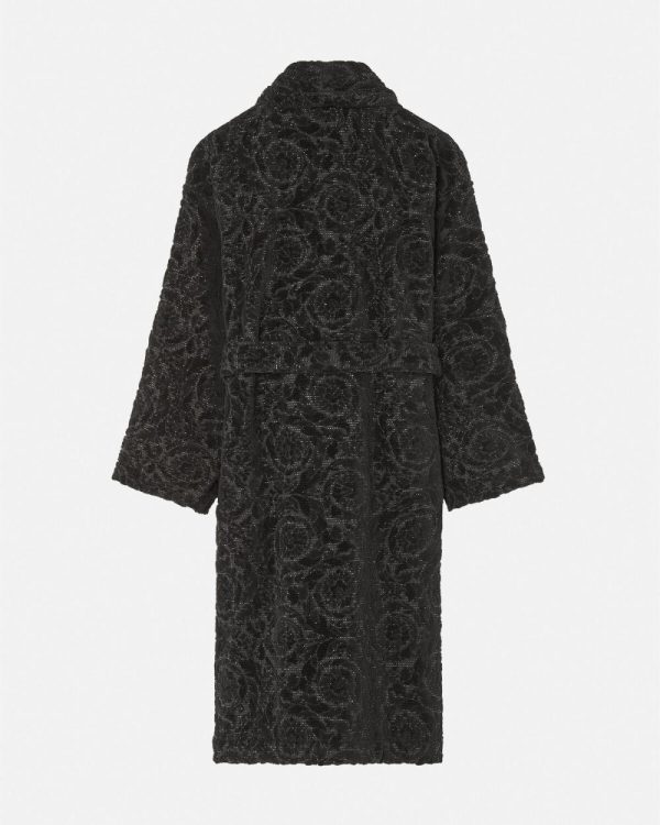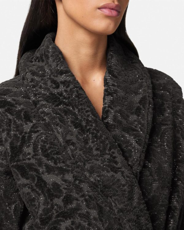 A plush terry-toweling cotton bathrobe with a tone-on-tone Barocco pattern and lurex threading throughout.