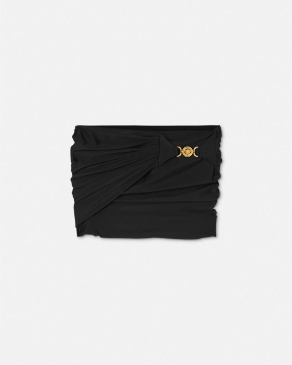 This mini skirt cover-up has a slip-on design with ruched detailing and Medusa ’95 hardware. It can be worn over a matching bikini set.
