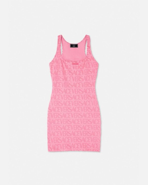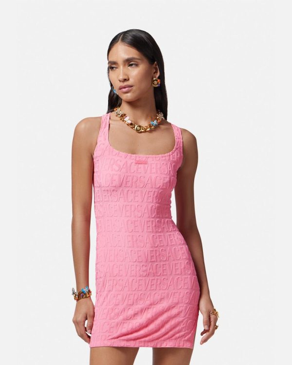 This sleeveless beachwear cover-up features a tonal Versace Allover pattern in a terry towelling texture. Dua Lipa x Versace is a capsule of styles designed in collaboration with Dua Lipa and presented on the runway in Cannes.