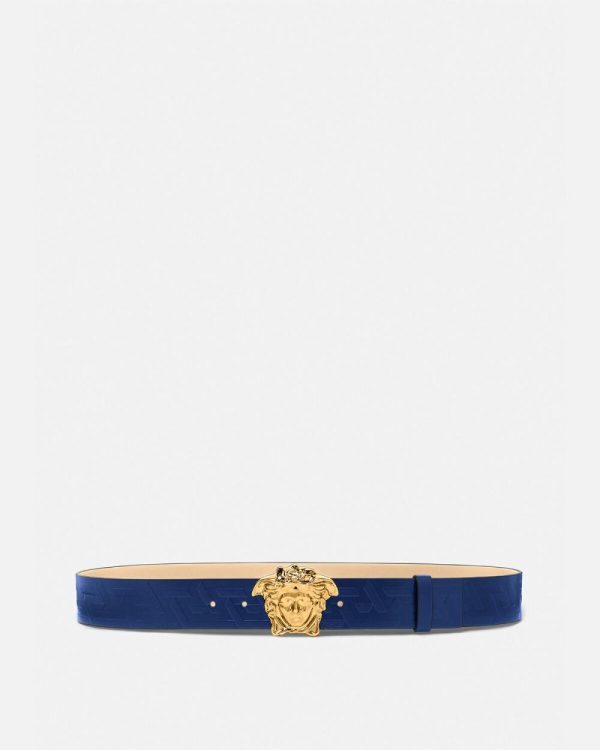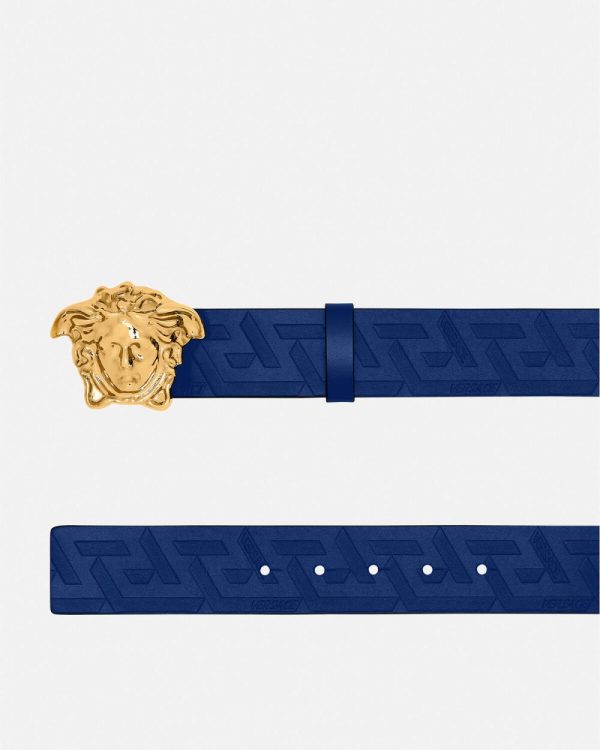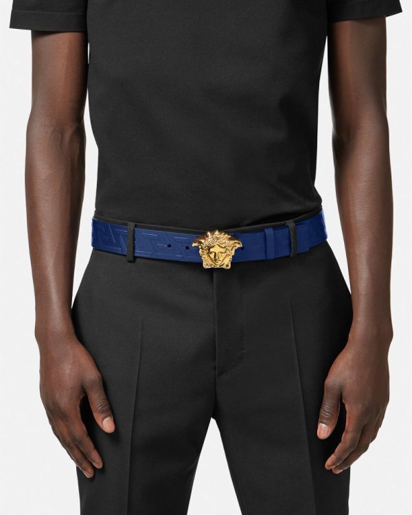 Crafted in Italy from supple Greca-embossed leather, this belt is embellished with a Medusa buckle.