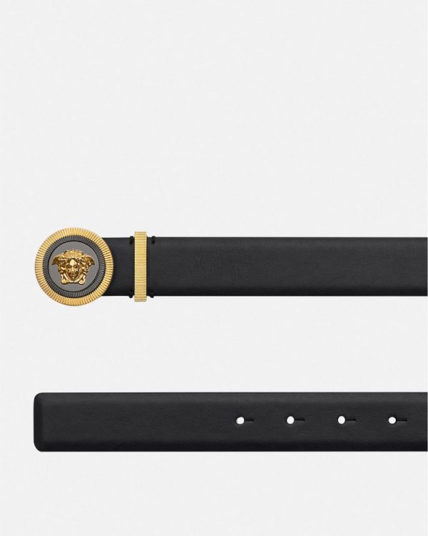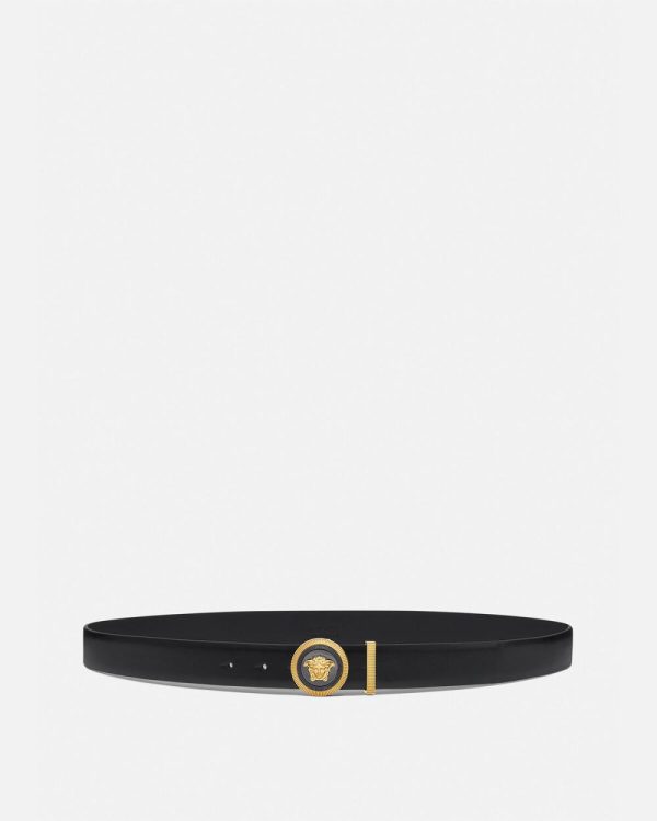 This belt is crafted from leather featuring a Medusa Biggie buckle and metal accent belt loop.