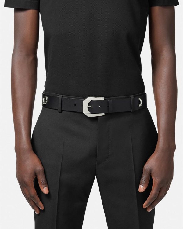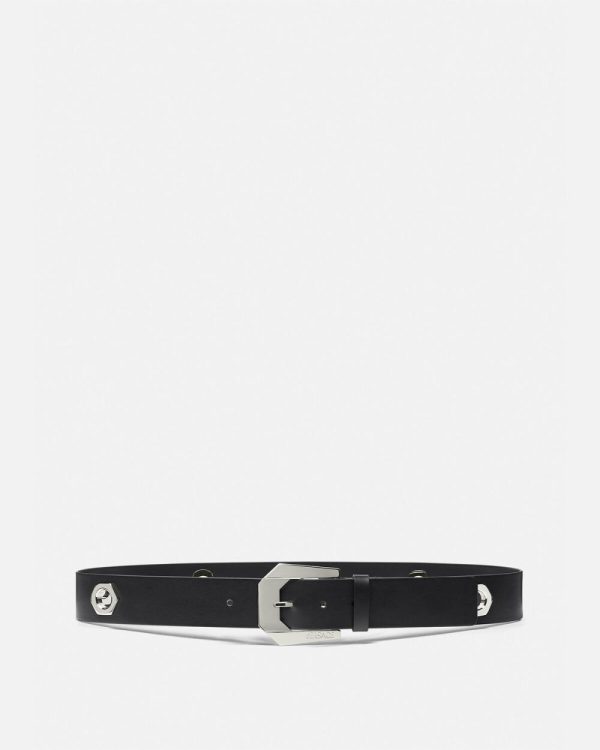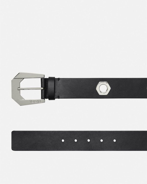 This leather belt features the Medusa Heritage buckle with nuts and bolts stud inserts.
