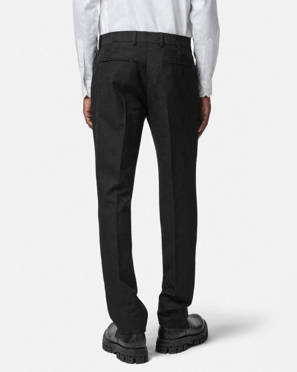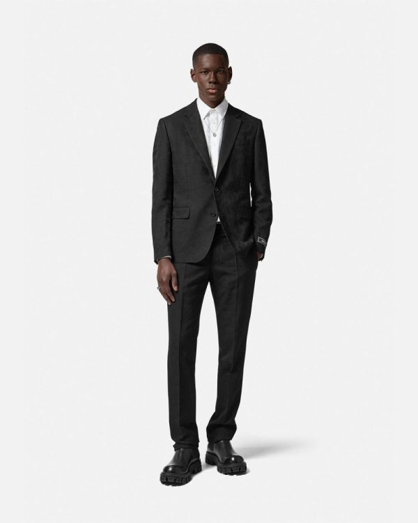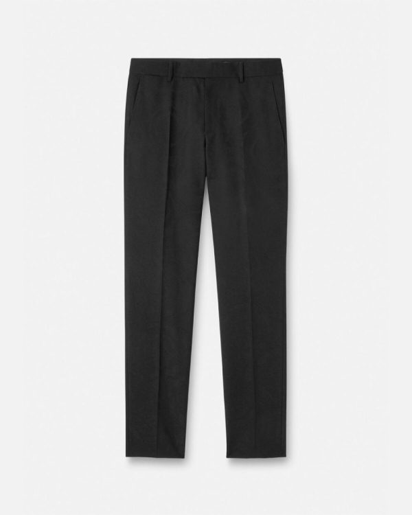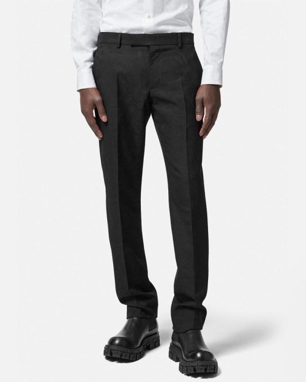 These formal wool pants feature a tonal Barocco Silhouette jacquard pattern. The tapered style can be worn with a matching suit blazer.