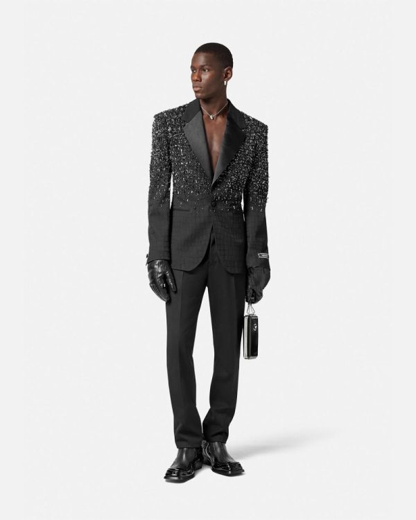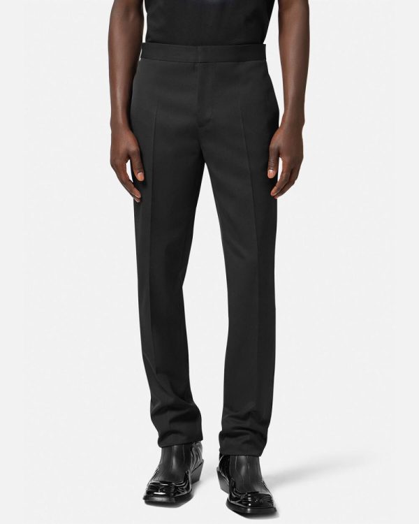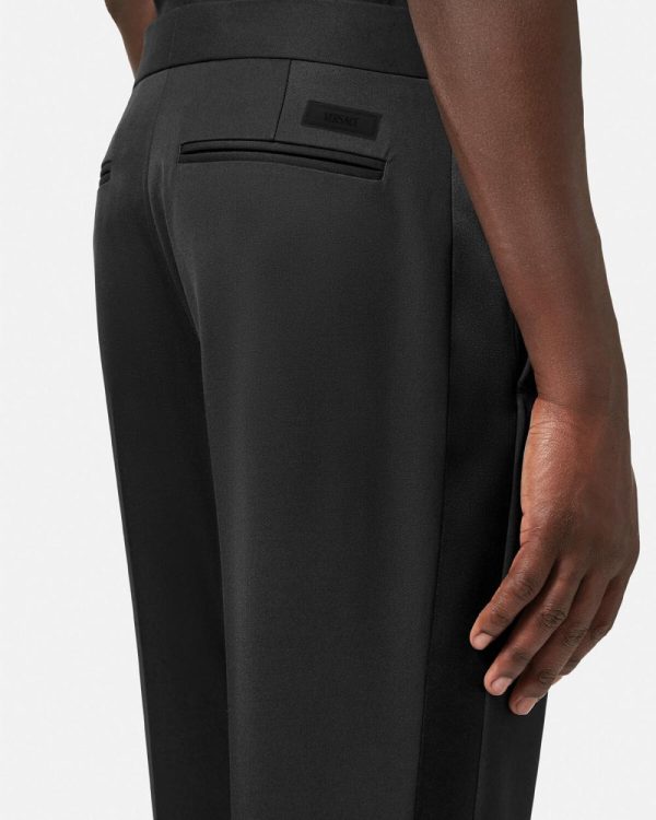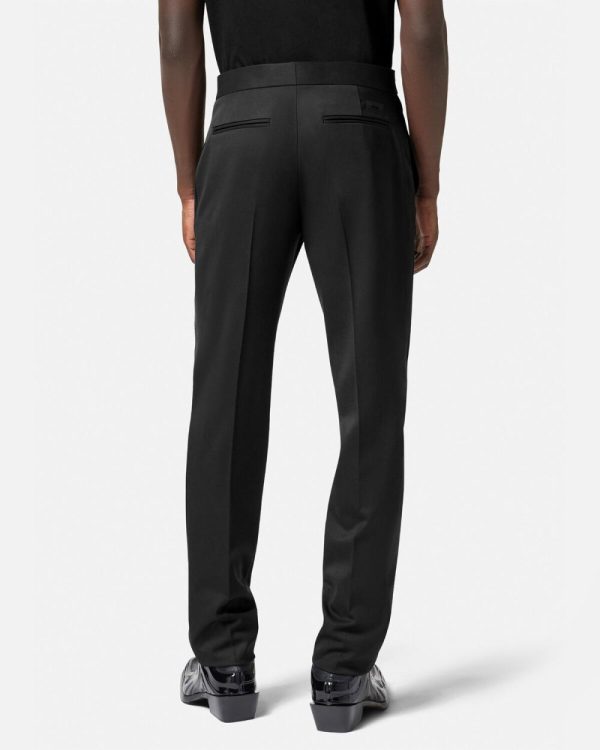 These formal suit pants are made from Barathea wool and have duchesse satin band inserts at the side. The tapered style has a tonal tailoring label and can be worn with a matching suit blazer.