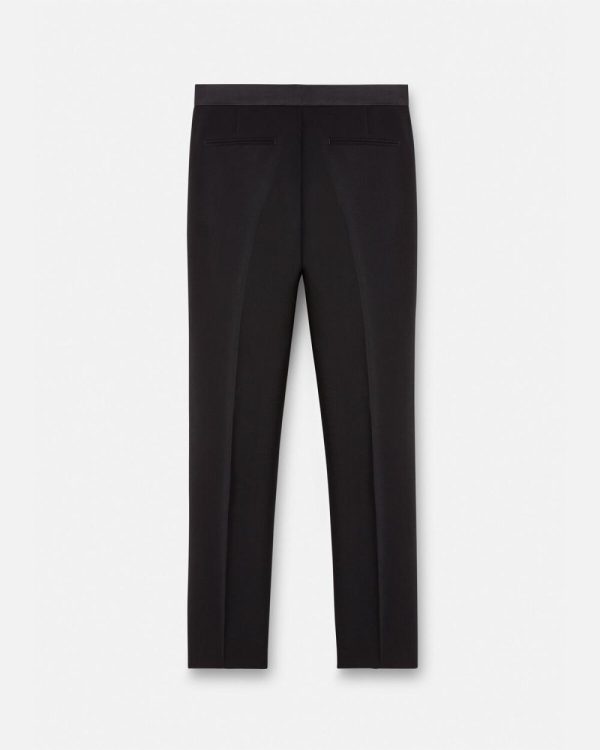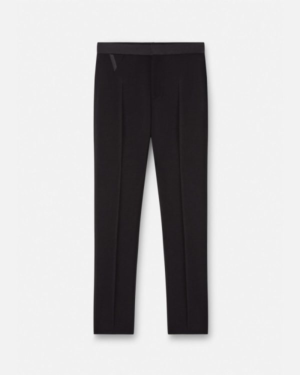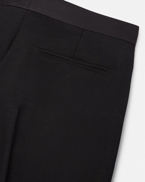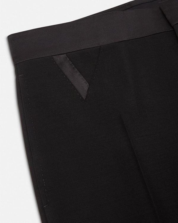In a cashmere and wool blend, these tailored evening pants have a tapered fit and feature a satin waistband. They’re finished with a V-shaped trim at the side pockets.