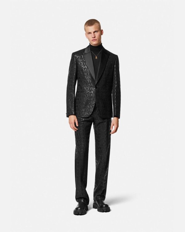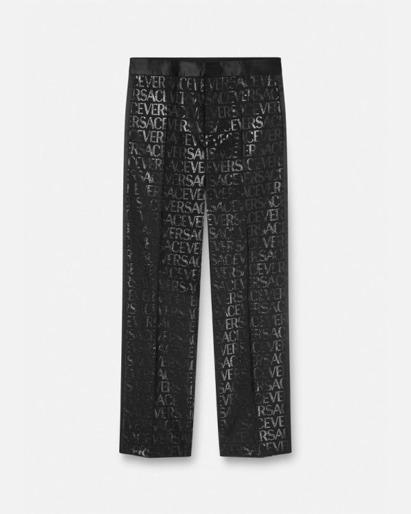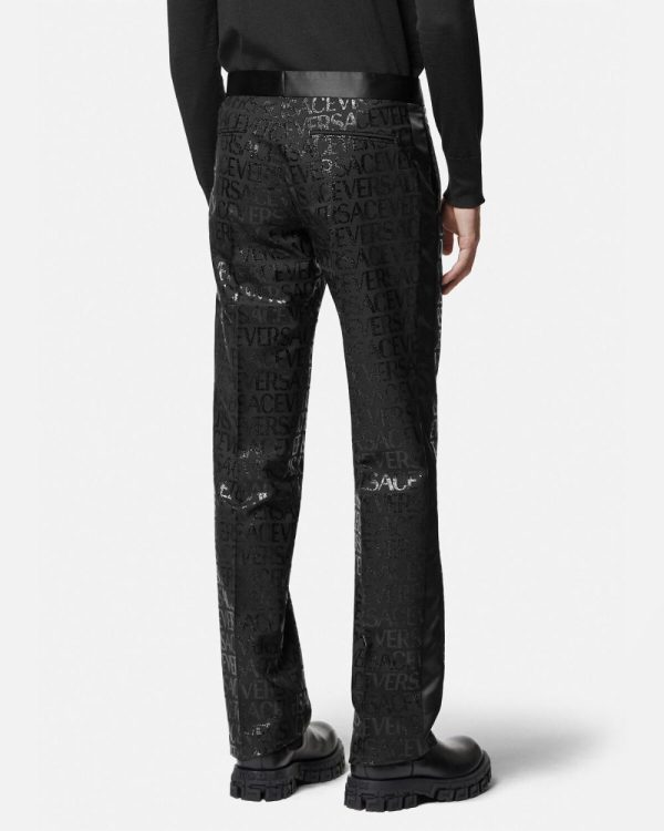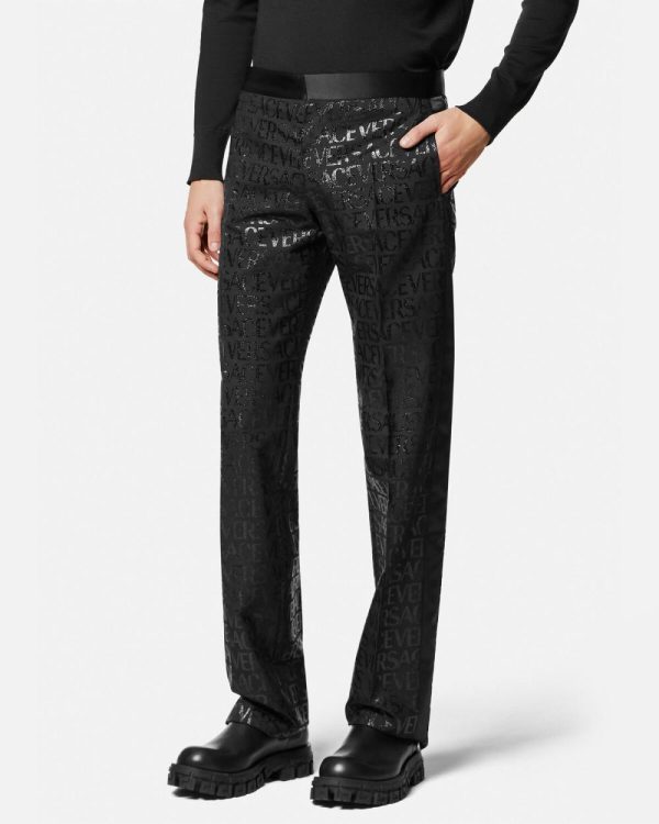 These tailored trousers have a tapered fit and feature the Versace Allover logo in tonal metallic threading, detailed with satin trims.