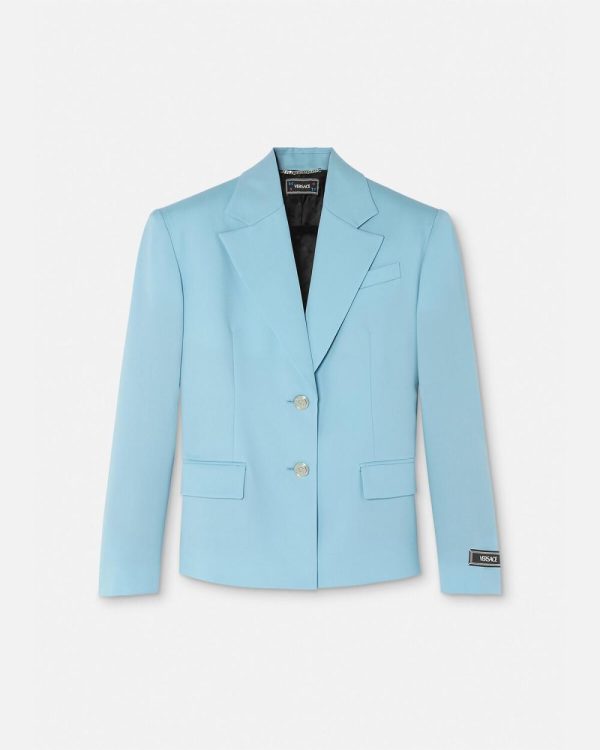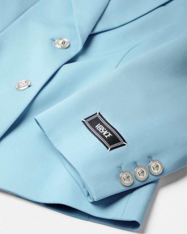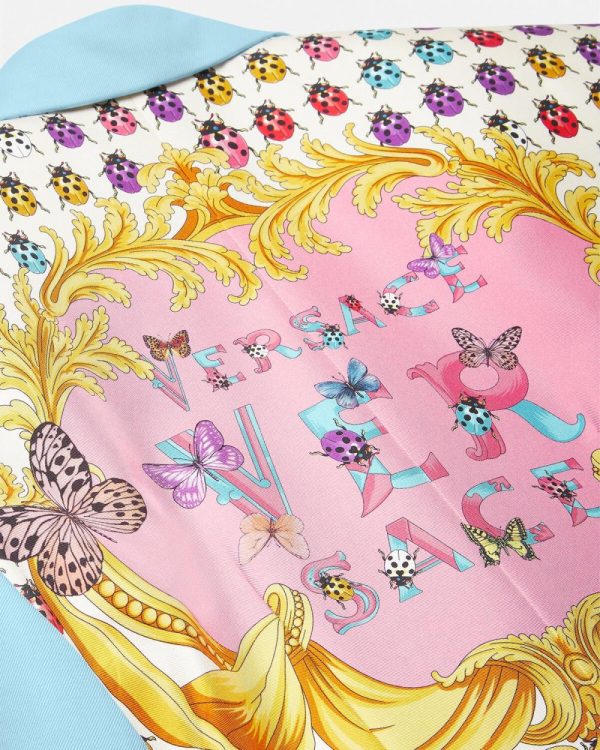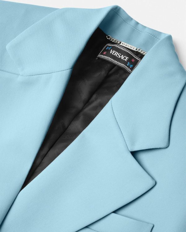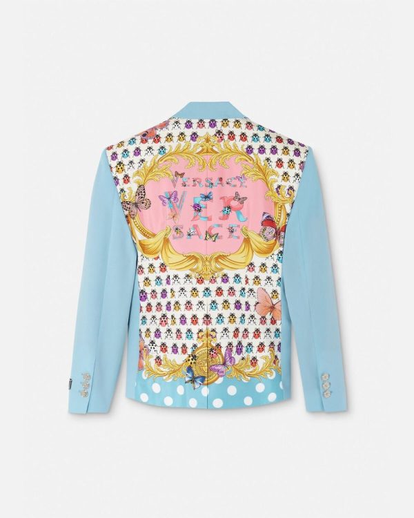 A wool single-breasted tailored blazer featuring a silk twill printed back panel with polka dot butterfly and ladybug motifs. The sartorial style is complete with a Versace tailoring label on the sleeve.