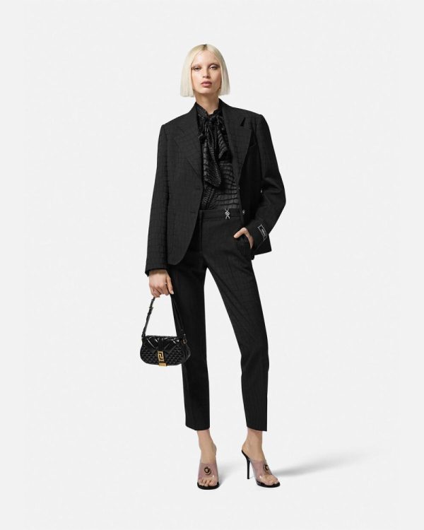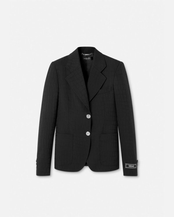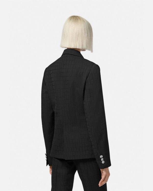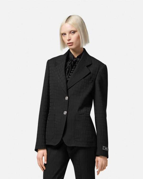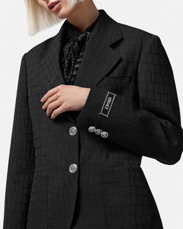 This fully-lined virgin wool single-breasted blazer features a tonal crocodile jacquard pattern with notched lapels, accent Medusa buttons, and tailoring label at the cuffs.