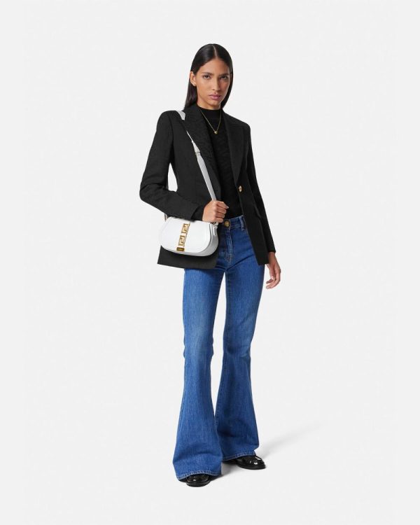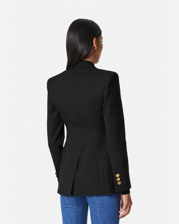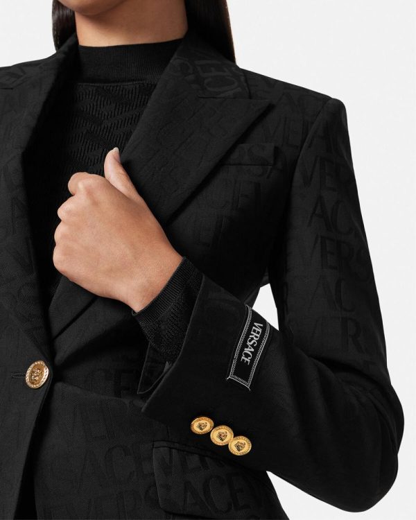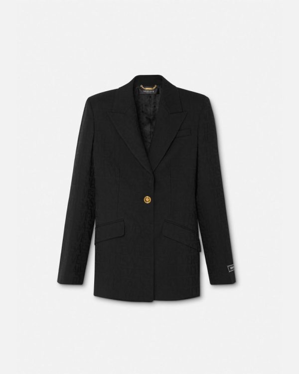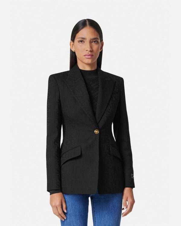Sharp, tailored shoulders feature on this single-breasted blazer with angular side pockets, a notched lapel, and a single Medusa button.