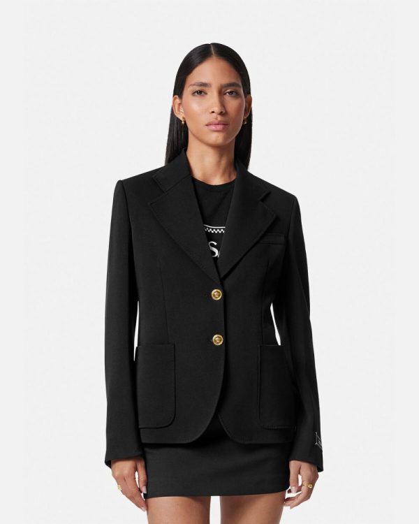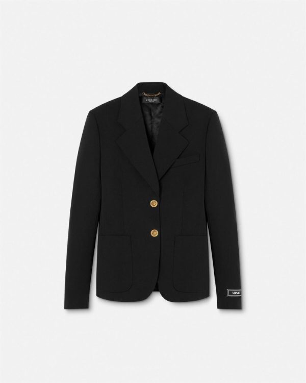 A fully lined single-breasted tailored blazer featuring accent Medusa buttons, a notched lapel, and a Versace label on the sleeve.