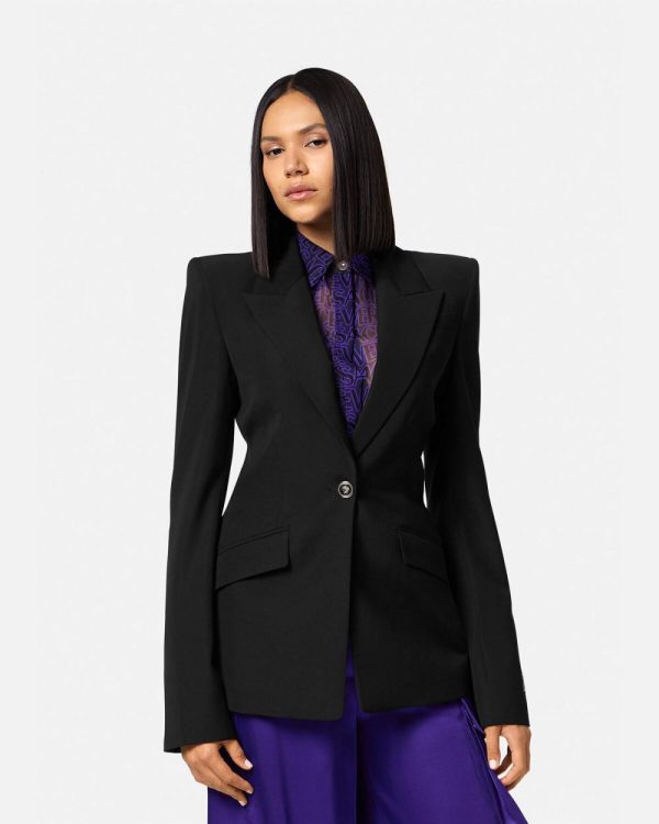 A fully lined tailored single-breasted blazer featuring an accent Medusa button, a notched lapel, and a stitched Versace label on the sleeve cuff.