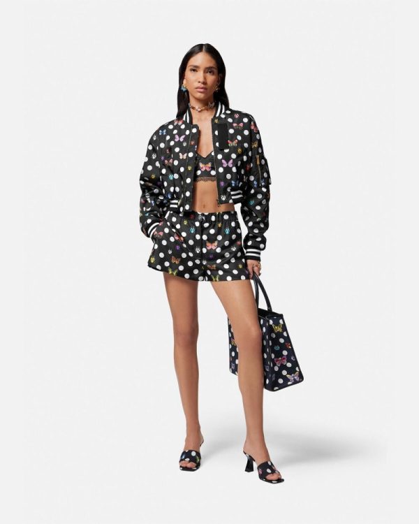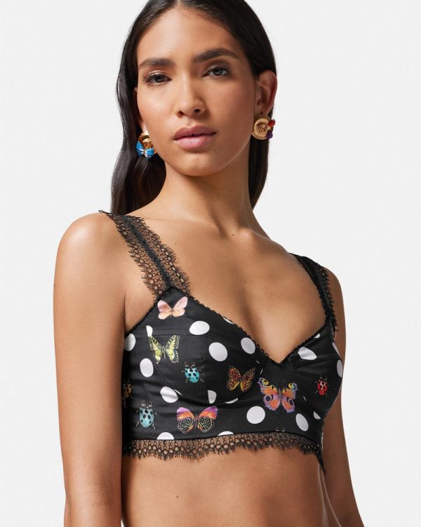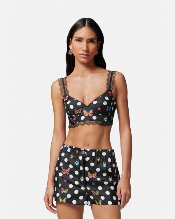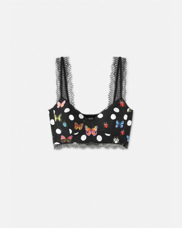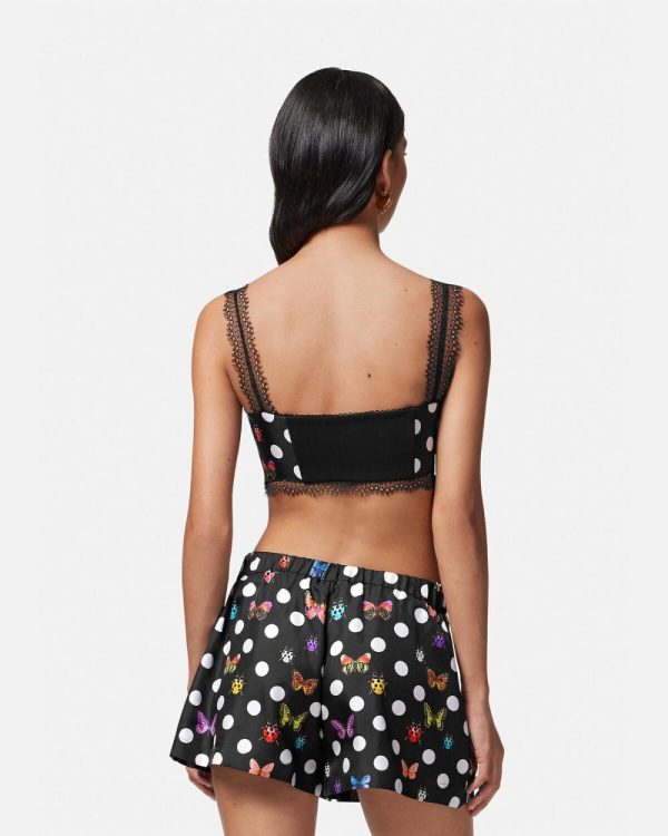 Versace presents Dua Lipa x Versace – a capsule collection co-designed with Dua Lipa. This silk polka dot bustier top features a butterflies and ladybugs print with lace trims and unpadded underwire cups.