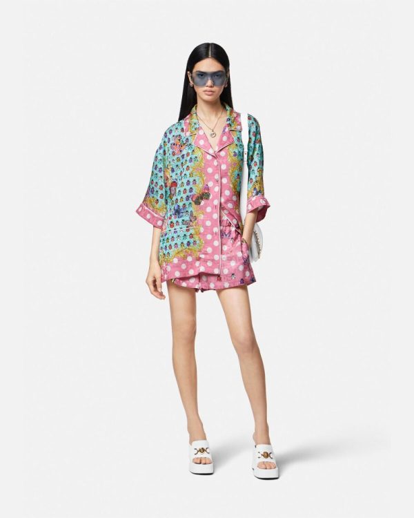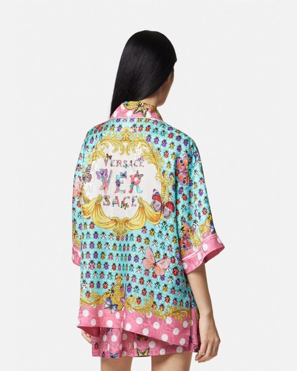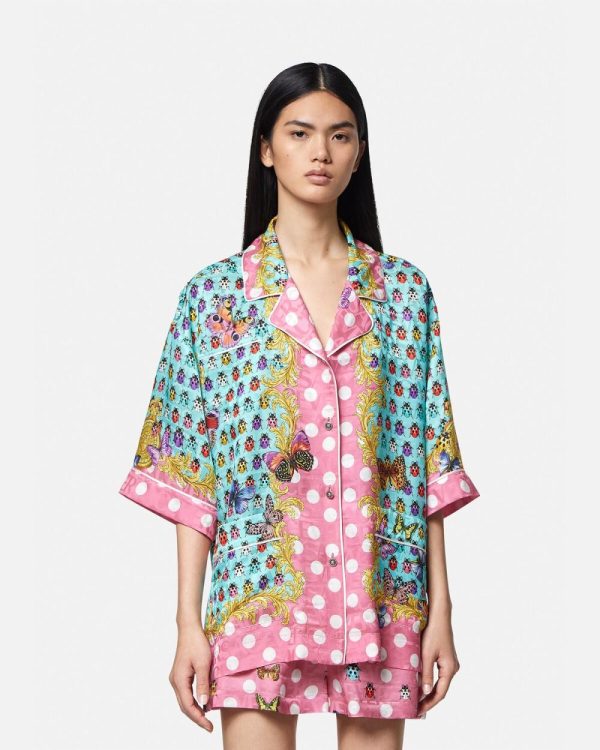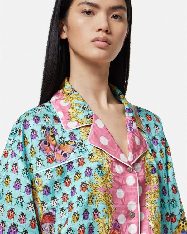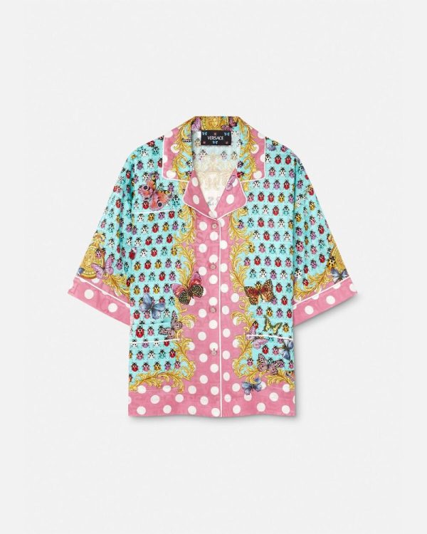 A loungewear-inspired short-sleeved shirt made from a blended silk twill featuring the Heritage Butterflies and Ladybugs print, detailed with contrasting satin piping and Medusa hardware.
