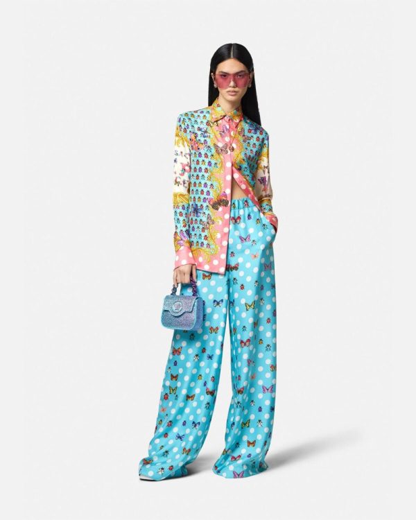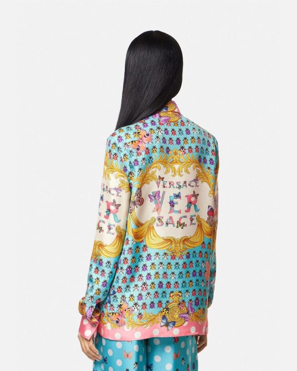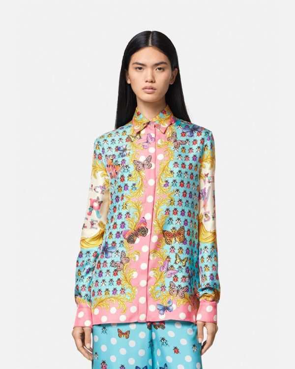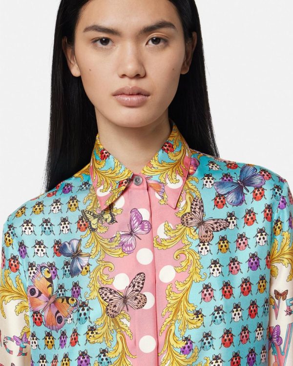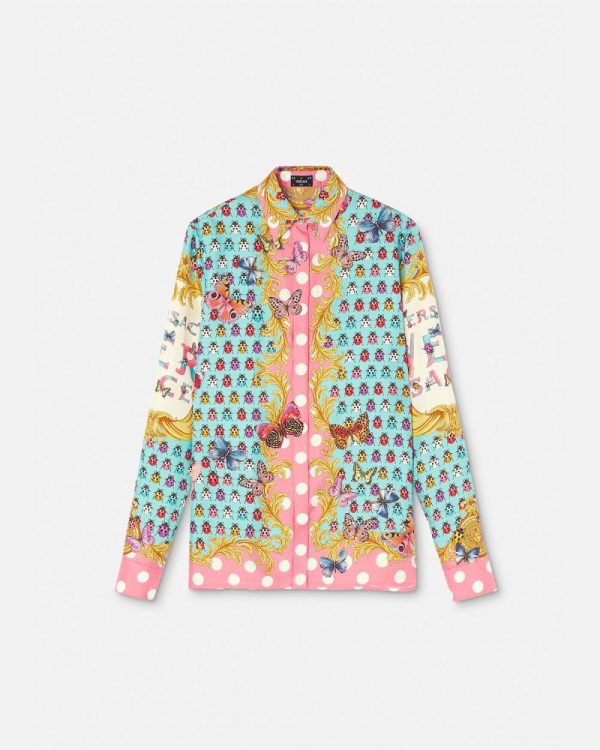 A silk twill long-sleeved shirt featuring a Heritage Butterflies and Ladybugs print – a refreshed archival pattern set against a polka dot background and Baroque flourishes.