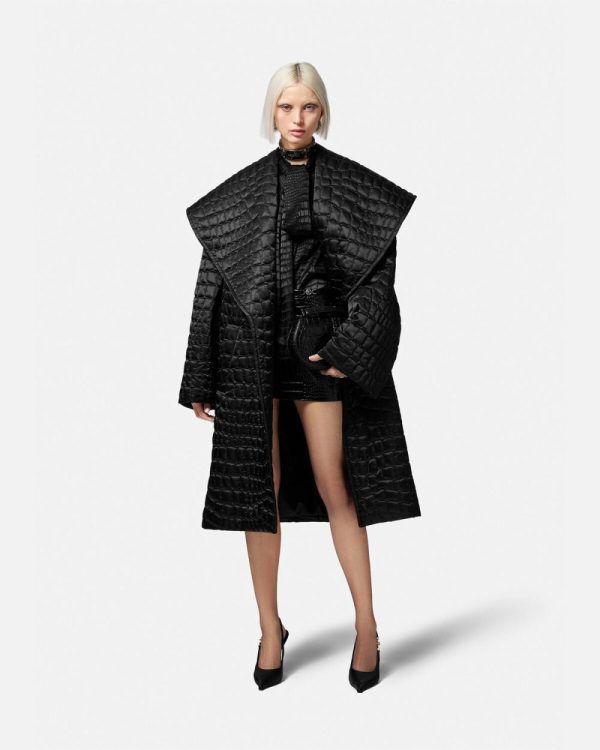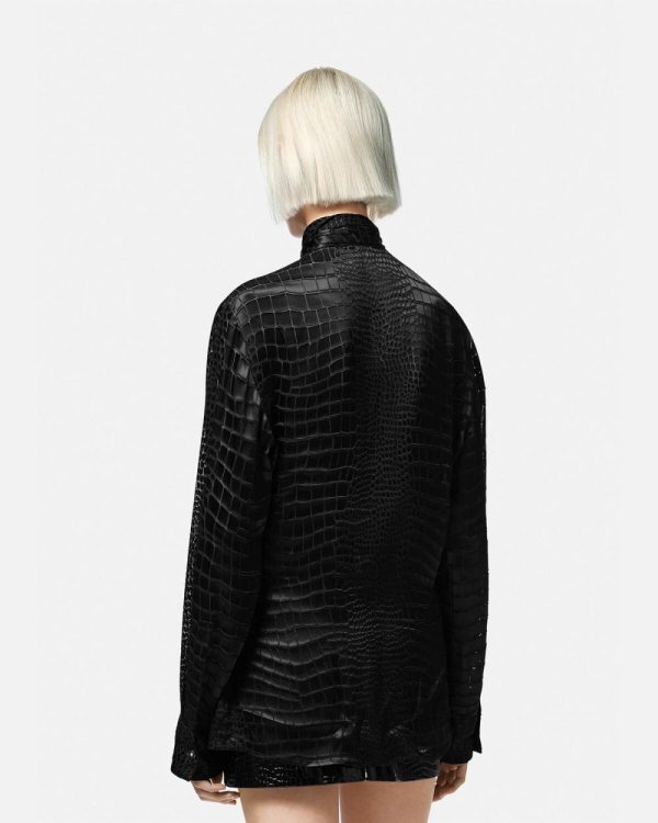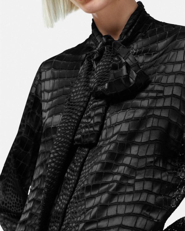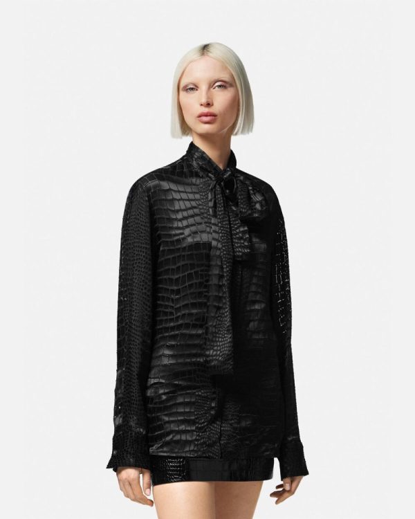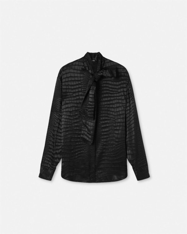 This silk-blend shirt features a devoré croc-effect motif with a scarf-tie and concealed button-down closure, detailed with accent Medusa buttons at the cuffs.