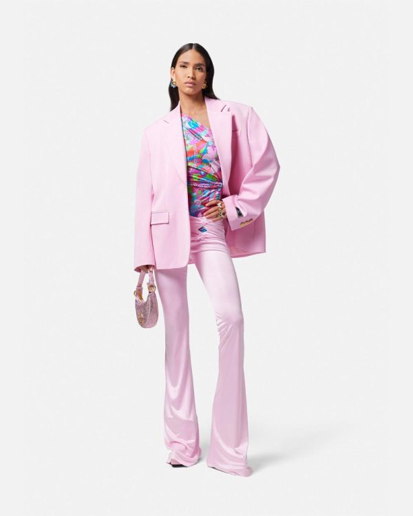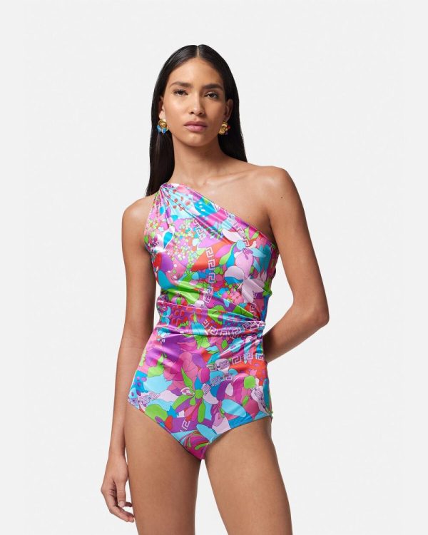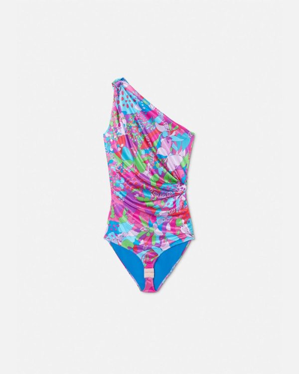 Dua Lipa is guest designer of the Dua Lipa x Versace capsule collection, made in collaboration with Donatella Versace. This fluid jersey one-shoulder bodysuit features a multicoloured Floral Summer print with a draped knot detailing at the side.