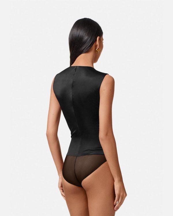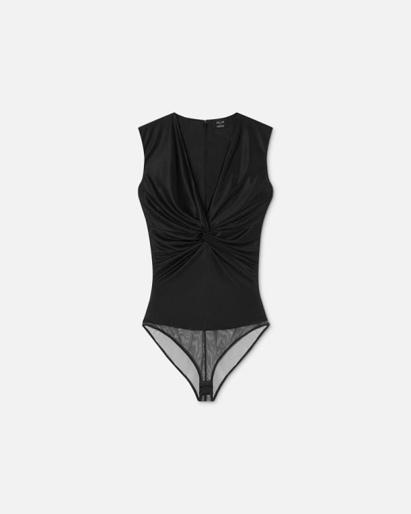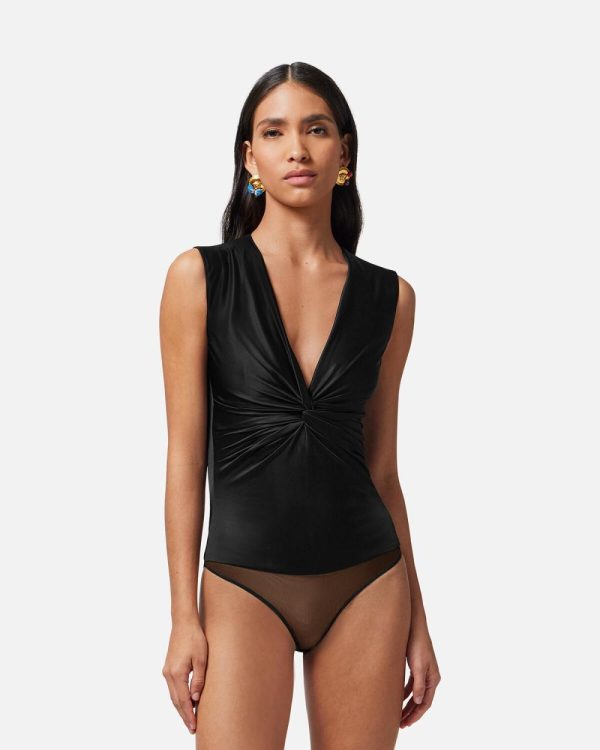 Dua Lipa is guest designer of the Dua Lipa x Versace capsule collection, made in collaboration with Donatella Versace. This fluid jersey sleeveless bodysuit features cutout knotted details at the front in a draped effect with a concealed back closure.
