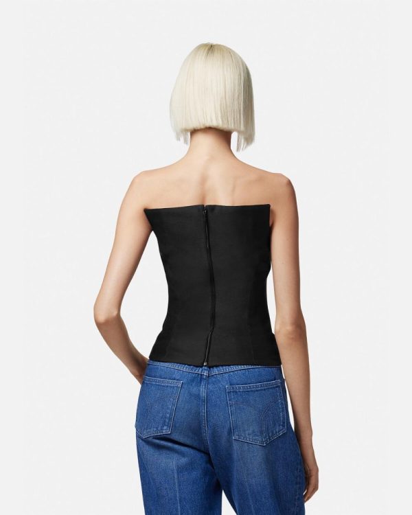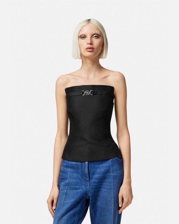 A structural wool and silk blend sleeveless top that accentuates the hourglass frame, accented by Medusa ’95 hardware and a ‘nastro Gianni’ archival trim.