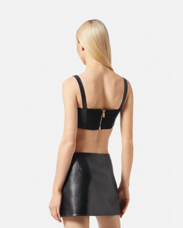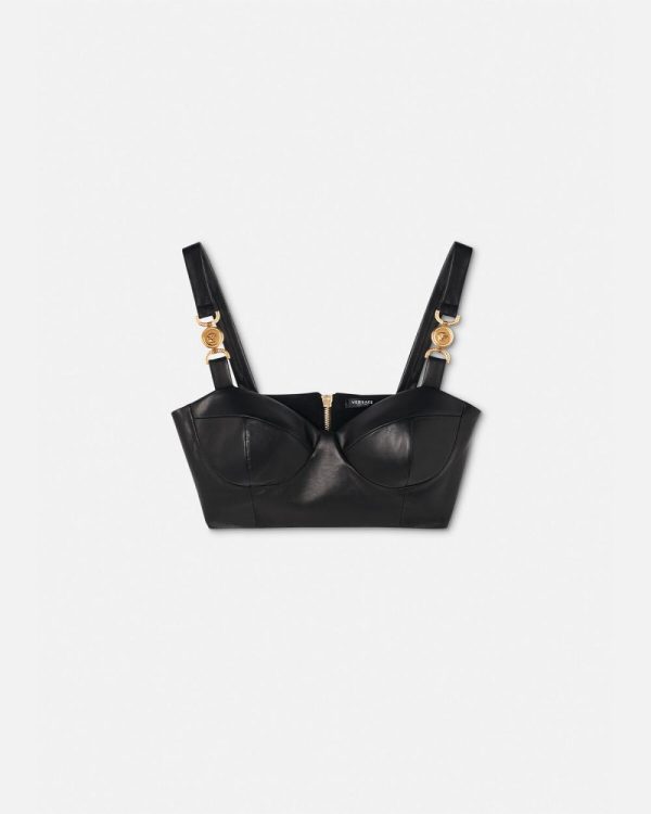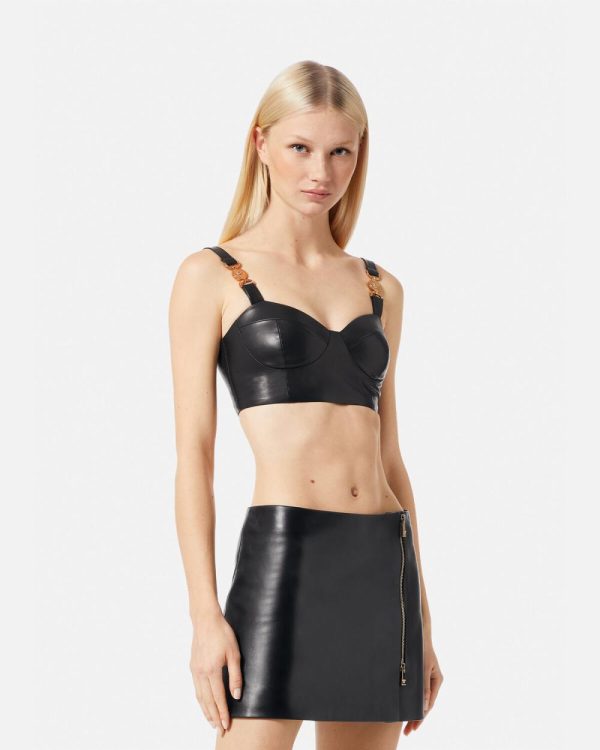 This bustier leather top is accented by the Medusa ’95 hardware on the shoulder straps and presents a back zip closure.