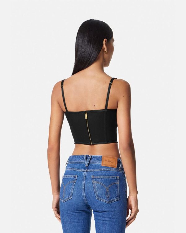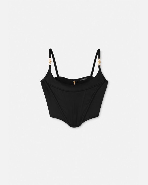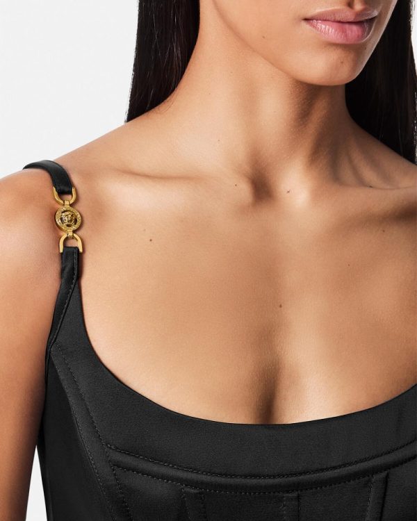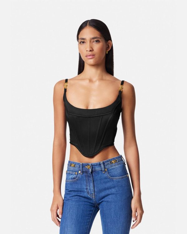 A reworking of the signature Atelier Versace corset, this top is cinched at the waist with V-shaped boning that accentuates the form. The cropped style is crafted in an elegant satin finish with Medusa hardware at the shoulder straps.
