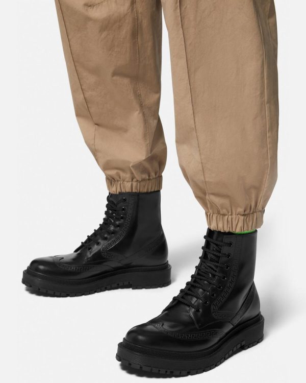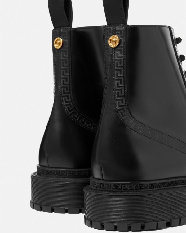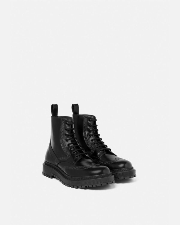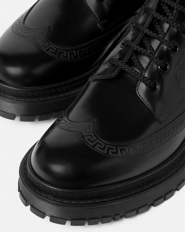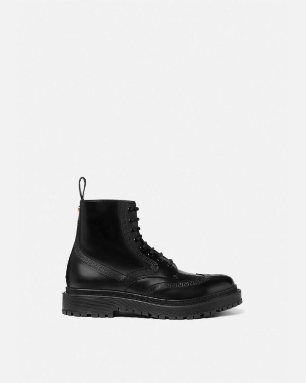 Set on treaded rubber soles, these ankle boots are crafted from polished leather with La Greca brogue detailing in a lace-up design.