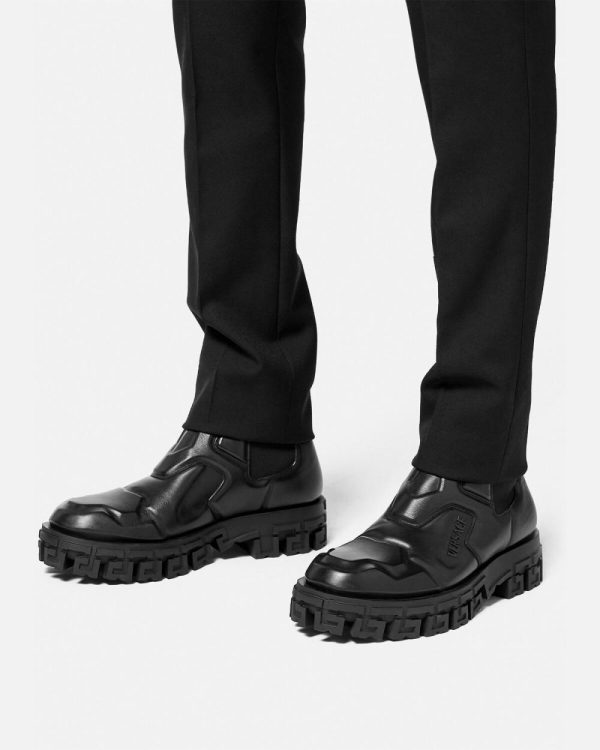 These chunky leather are boots are made from individually stitched three-dimensional leather panel uppers and feature the House Greca signifier across the rubber sole.