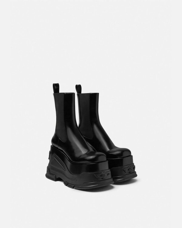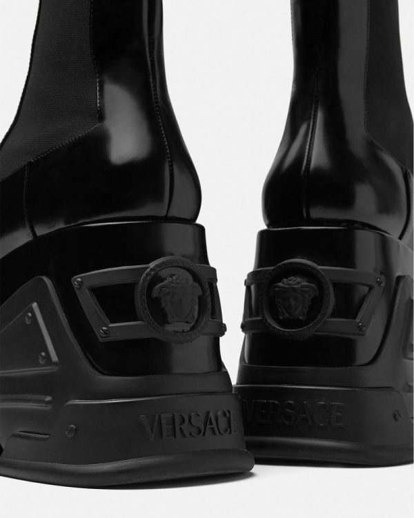 The Medusa Anthem leather boot style is characterized by an extra-large moulded platform rubber sole. Tonal Medusa injections and elasticated side inserts complete the ankle-length style.