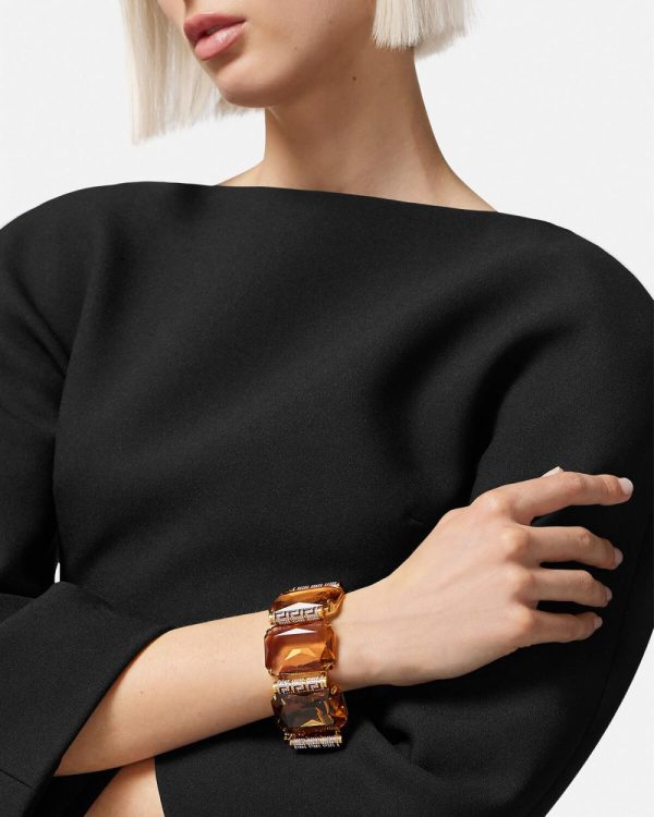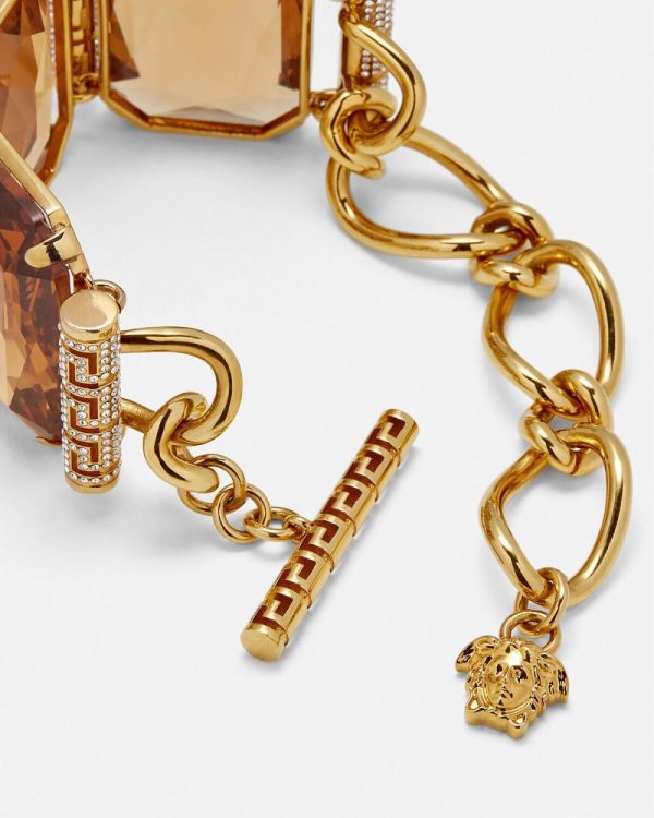 This bracelet features large emerald cut stones and crystal embellished Greca motifs. The elegant design is finished with large links and a T-bar adjustable closure. All Versace jewellery products are lead and nickel free. All materials are hypoallergenic