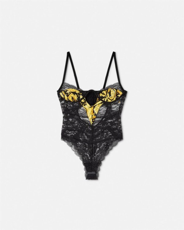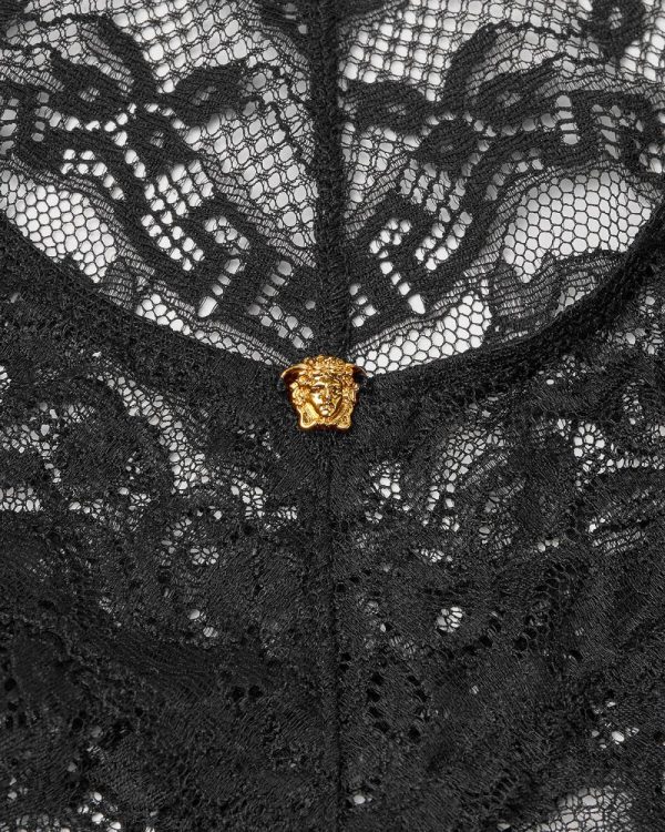Crafted from intricate Versace lace with a Greca motif, this bodysuit features a V-shaped Barocco print insert. A fluted neckline with quilted underwire cups completes the design. For hygiene purposes we advise to try on this item with personal underwear underneath.