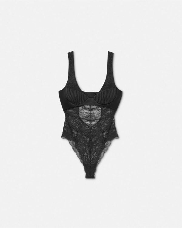 A bustier bodysuit featuring an intricate Versace lace with floral motifs and Greca pattern woven throughout its design, complete with quilted underwire cups. For hygiene purposes we advise to try on this item with personal underwear underneath.