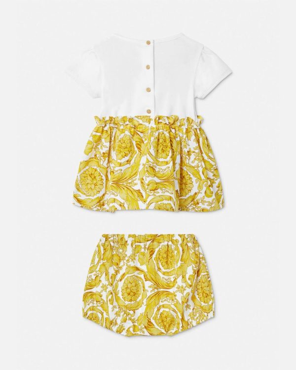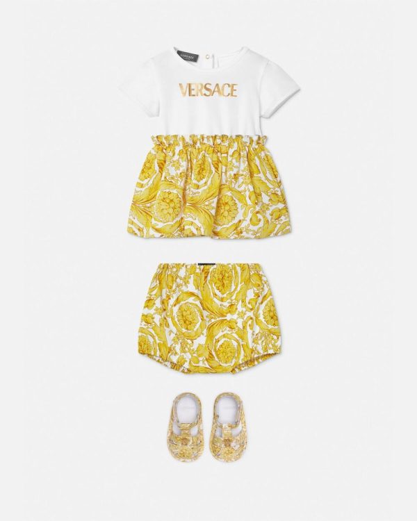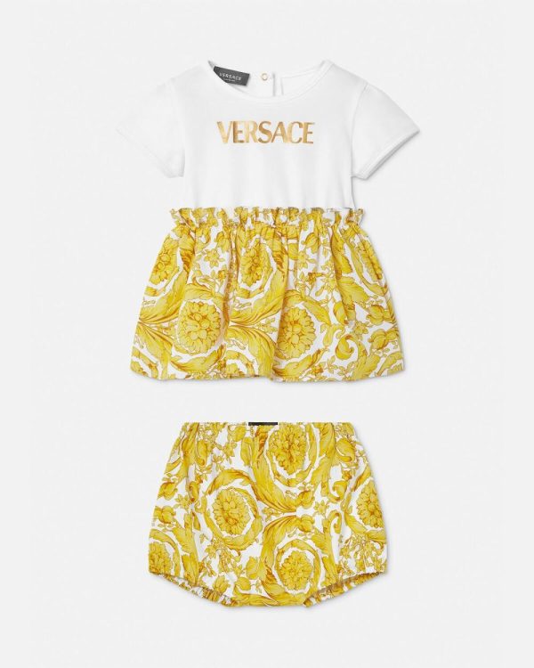 Soft and cosy, this dress and bloomer shorts set features the Barocco print bottoms and the logo in gold-foil on the top.