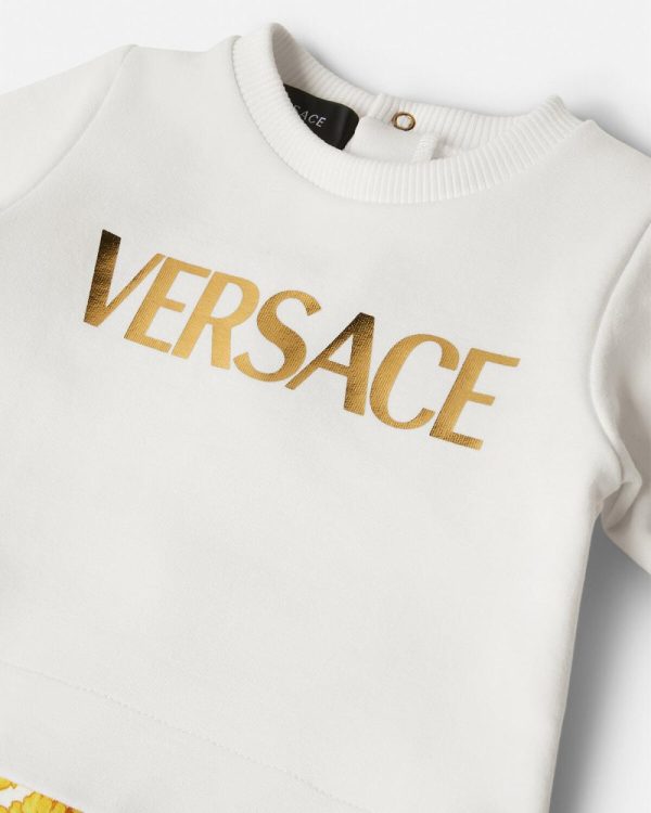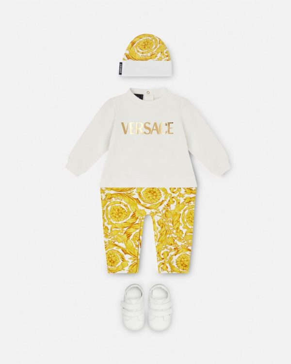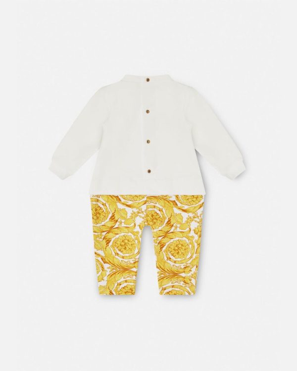 Soft and cosy, this babygrow features the Barocco print bottoms and the logo in gold-foil on the top.