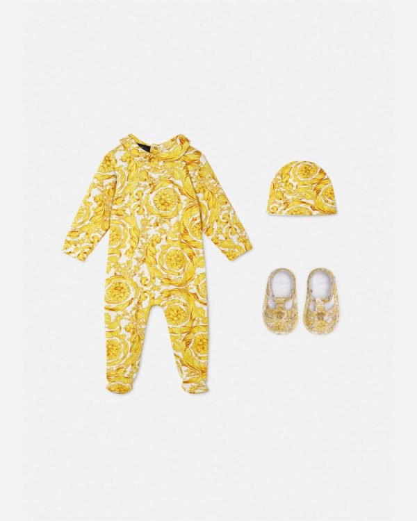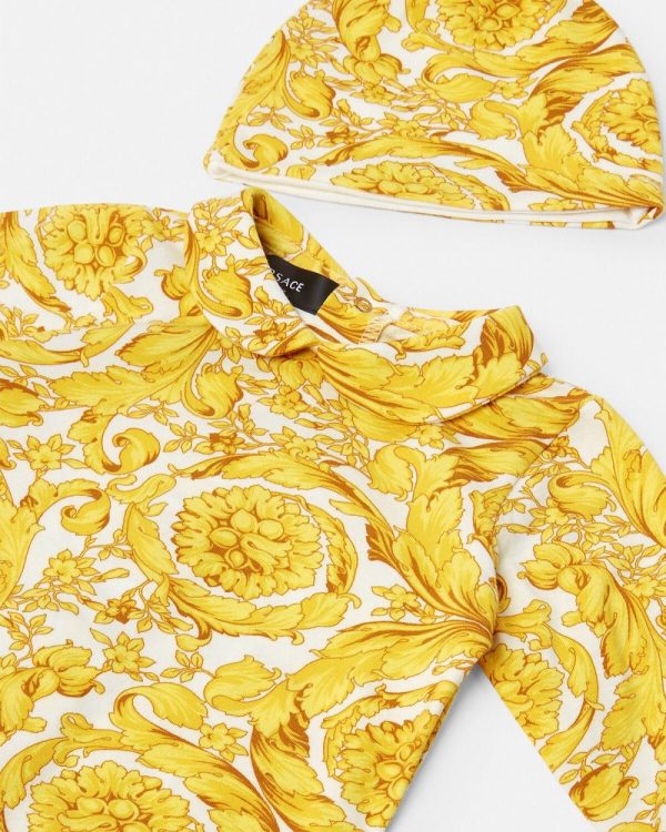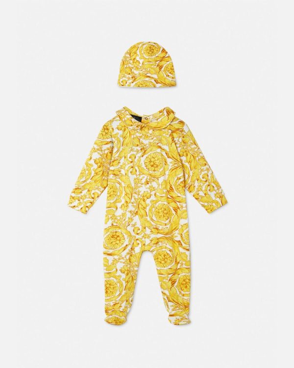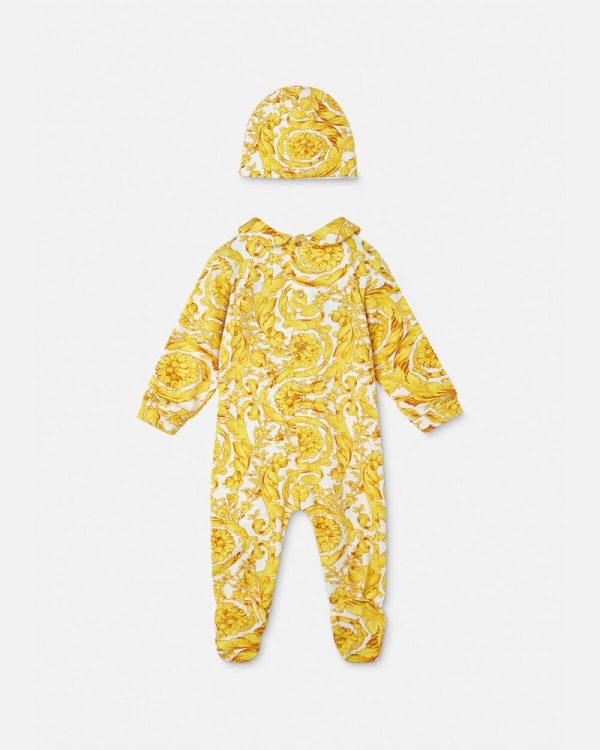 Soft and cosy, this baby set is crafted from cotton jersey in the Barocco print. The soft set features a Peter Pan collar babygrow paired with matching cap.