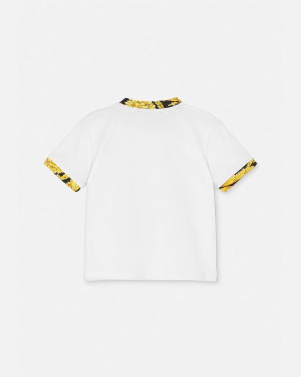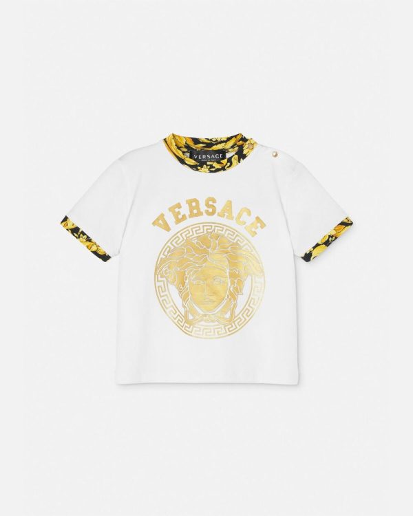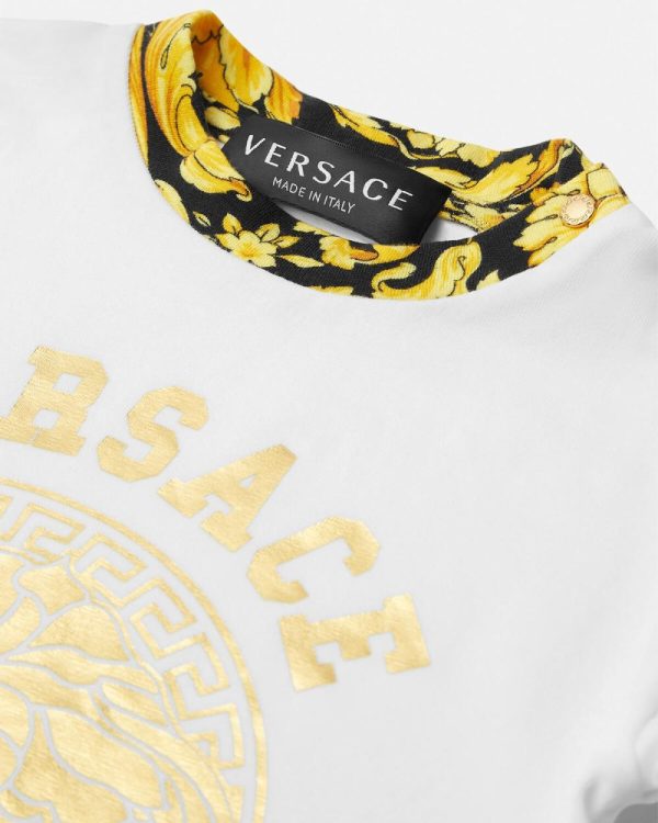 A short-sleeved cotton T-shirt for little ones featuring a foiled Varsity-inspired Versace Logo and Medusa Motif. Barocco printed trims and snap-button closures for easy removal finish the piece.
