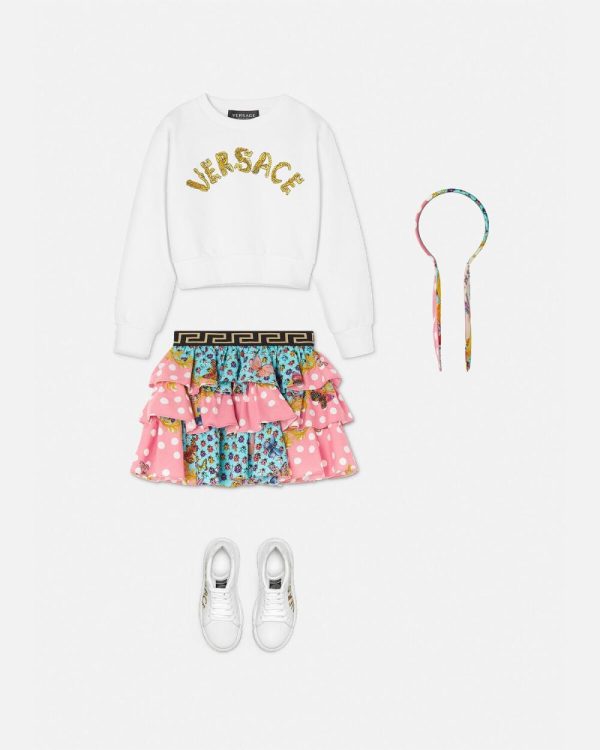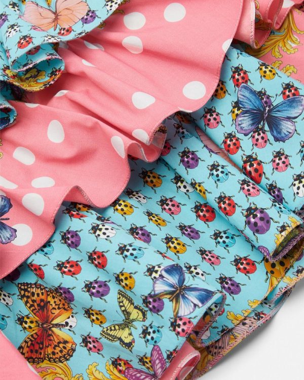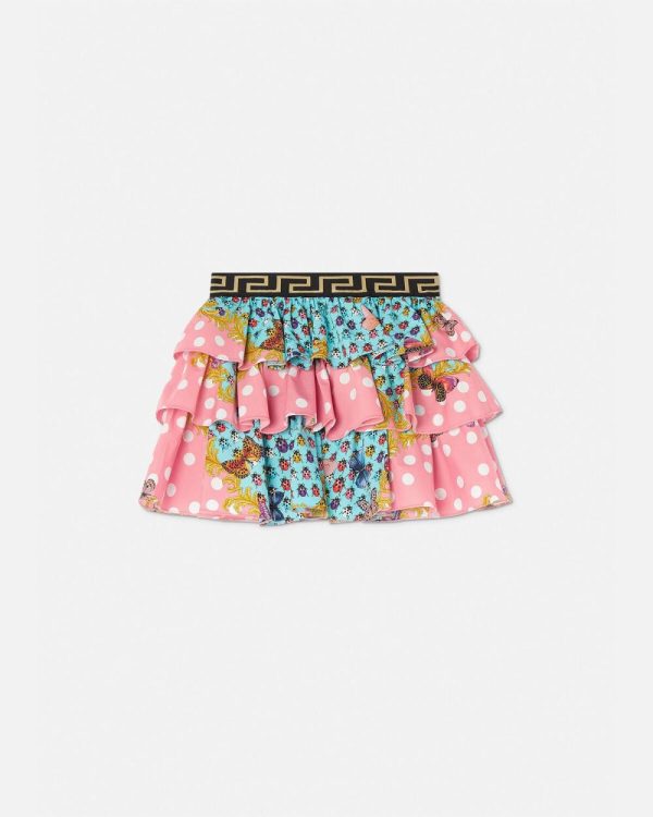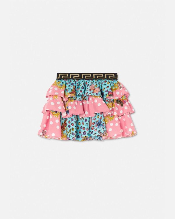 A slip-on cotton ruffled skirt featuring a comfy Greca border waistband and a mini-me print with butterflies, ladybugs, polka dots, and Baroque flourishes.