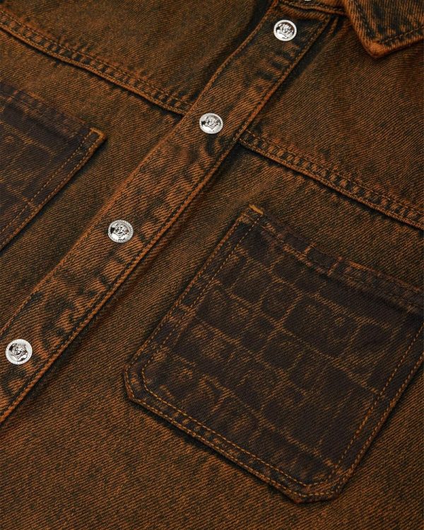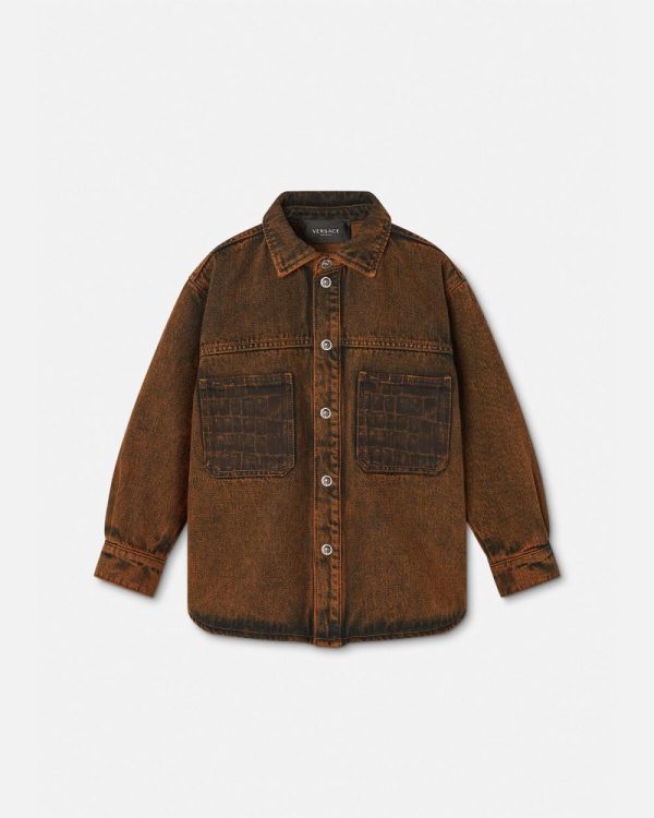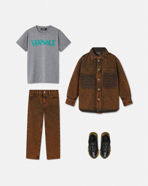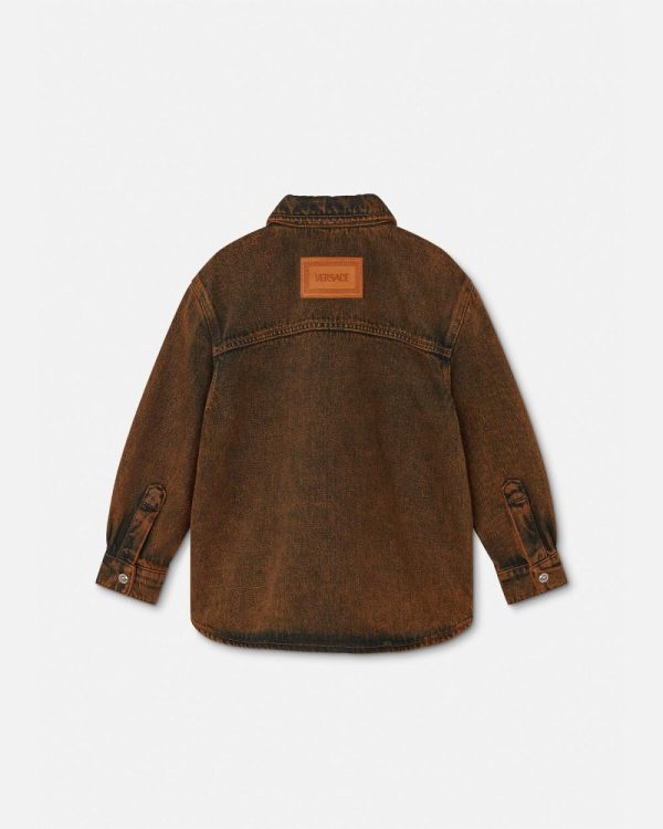 A mini-me denim jacket inspired by the men’s runway collection featuring the Coccodrillo Kids print at the chest patch pockets and accent Medusa buttons. The long-sleeved design is finished by a pointed collar and a back leather patch.