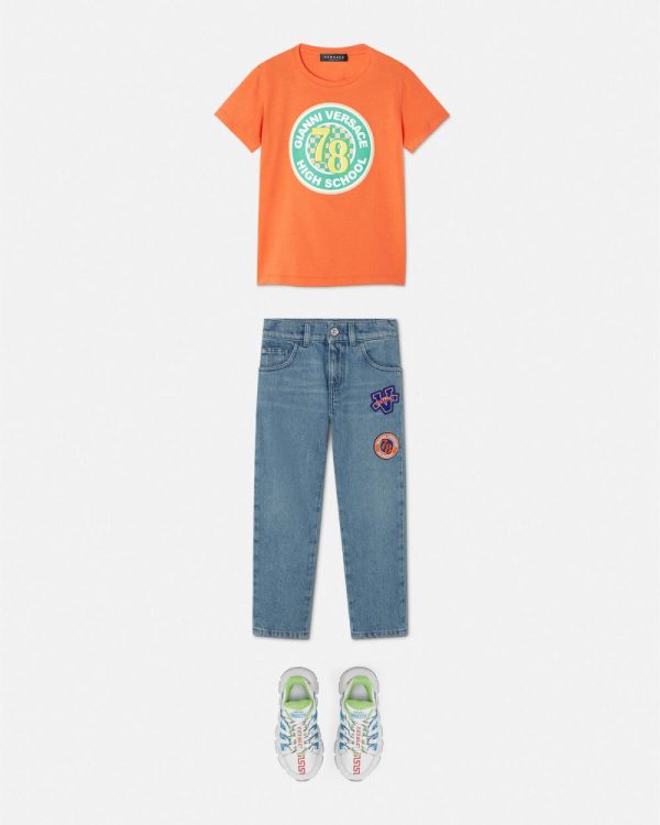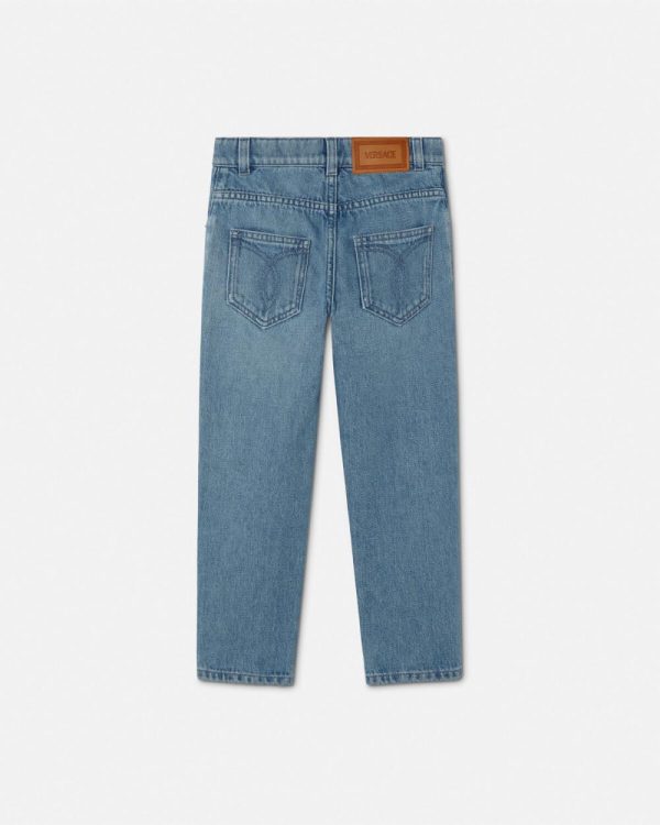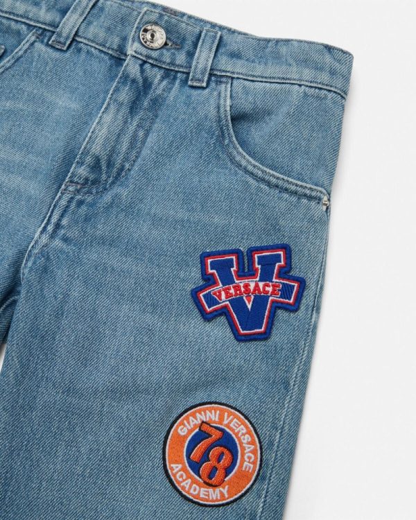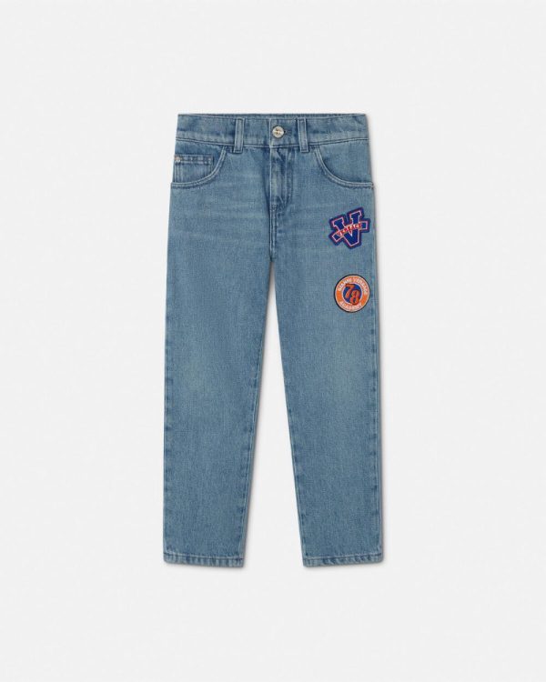 A pair of light-washed denim jeans featuring a five-pockets design and Varsity-inspired Versace Logo embroidered patches.