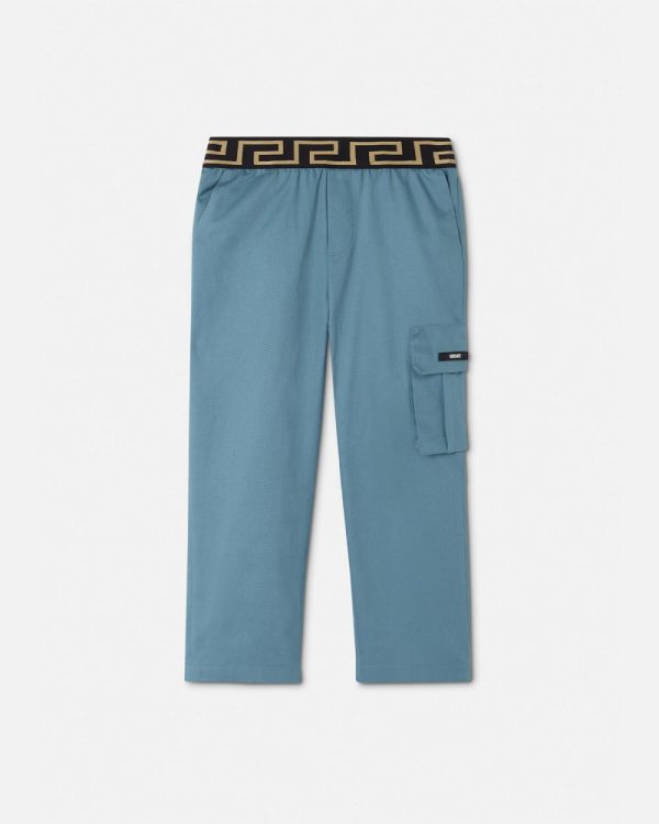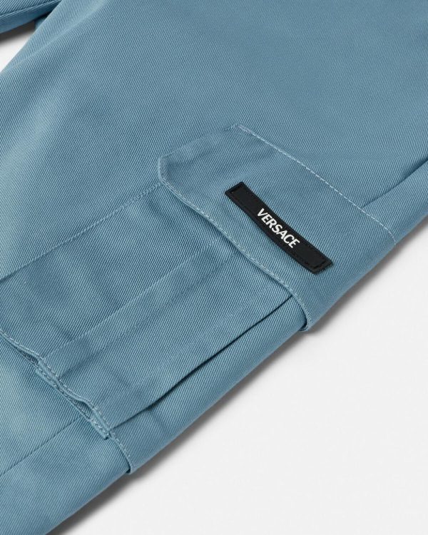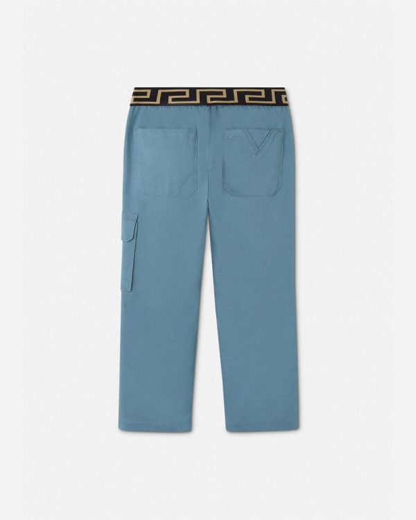 These straight-leg pants made from cotton gabardine features an elasticized waistband with Versace’s signature Greca border, and a rubber logo patch at the cargo pocket. The back pocket has a V-shape detailing.