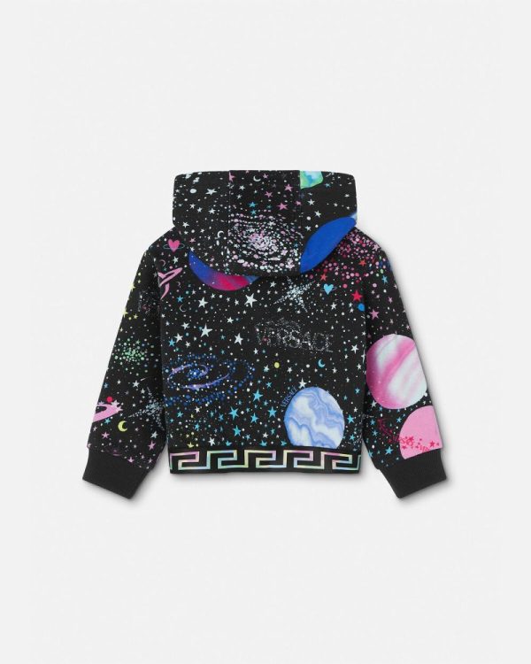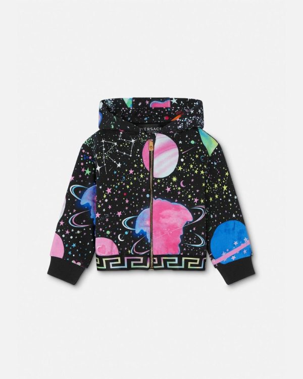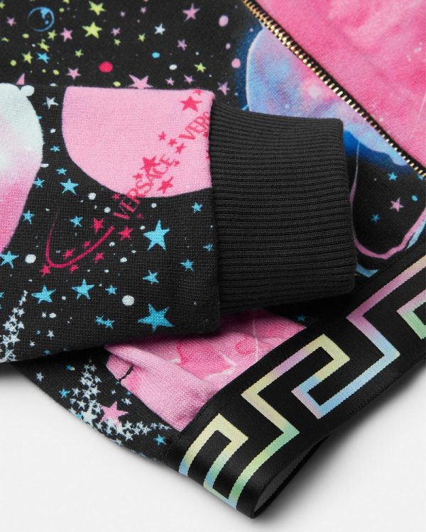A cotton jersey zipped hooded sweatshirt featuring a galactic print with the Versace Logo throughout. The style is detailed with a signature Greca border waistband.