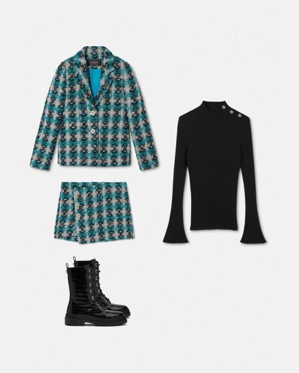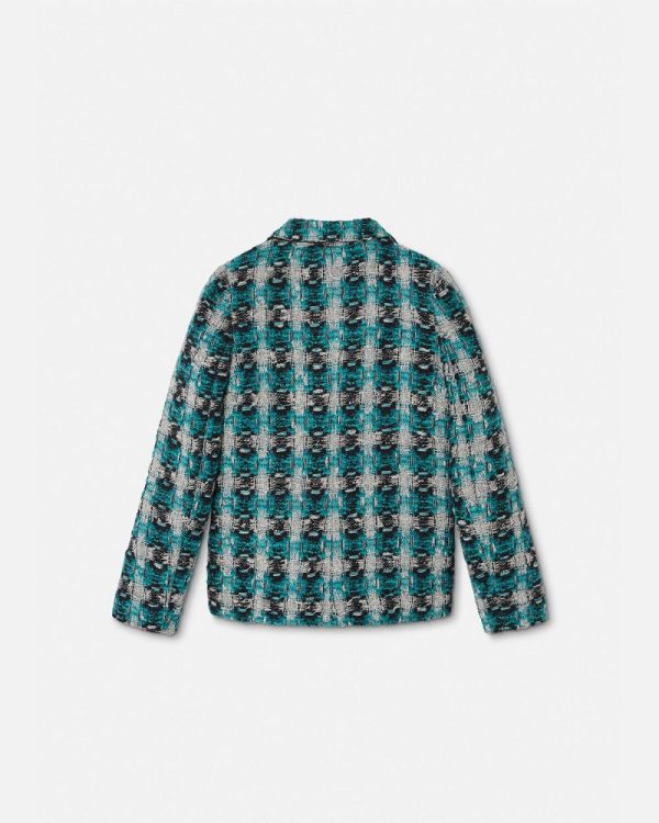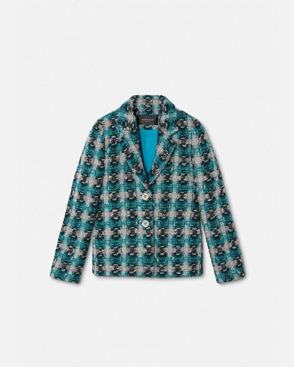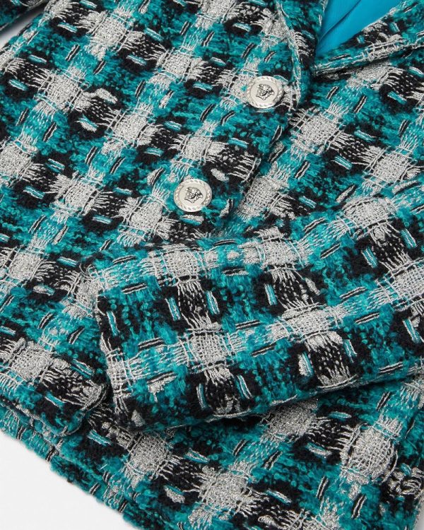 A tweed blazer with lurex threading featuring a single-breasted design and accented by Medusa buttons.