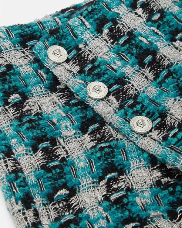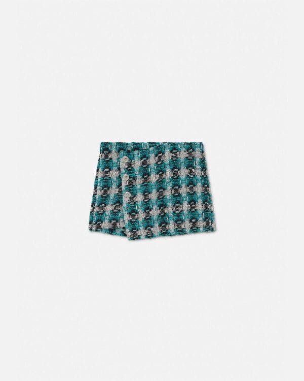 Tweed shorts with lurex threading featuring a front skirt wrap panel and accent Medusa buttons.