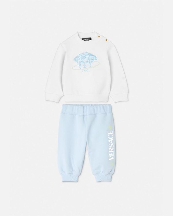A cozy sweatshirt and sweatpants set for the littlest ones made from cotton jersey, featuring a star printed Medusa and Versace Logo motif. Snap-button closures at the shoulder allow for easy removal.