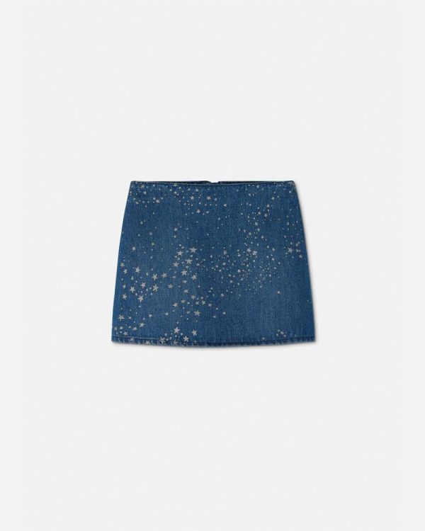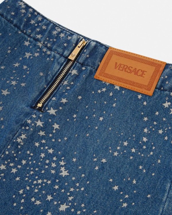 A cotton denim skirt featuring glittered star motifs throughout with a back Versace Logo.